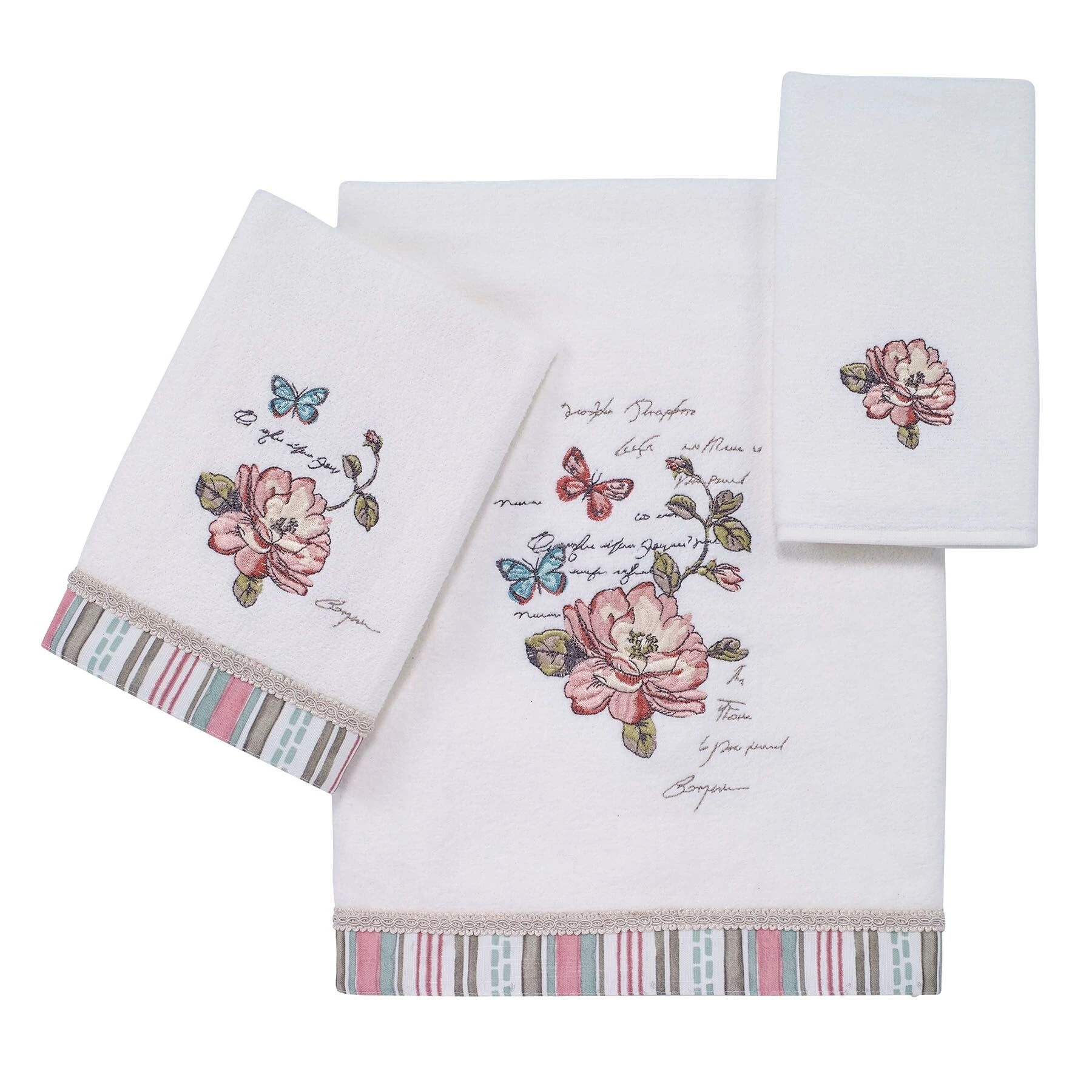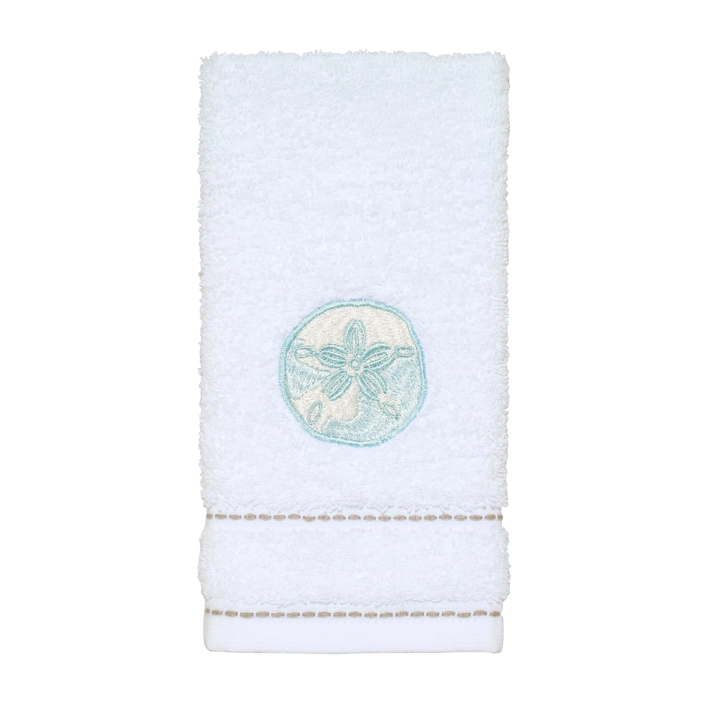 The Avanti Farmhouse Shell Fingertip Towel is embroidered with a light blue sand dollar on a 100% cotton white terry towel. The towel is bordered with 2 taupe broken horizontal polyester stripes. Imported.