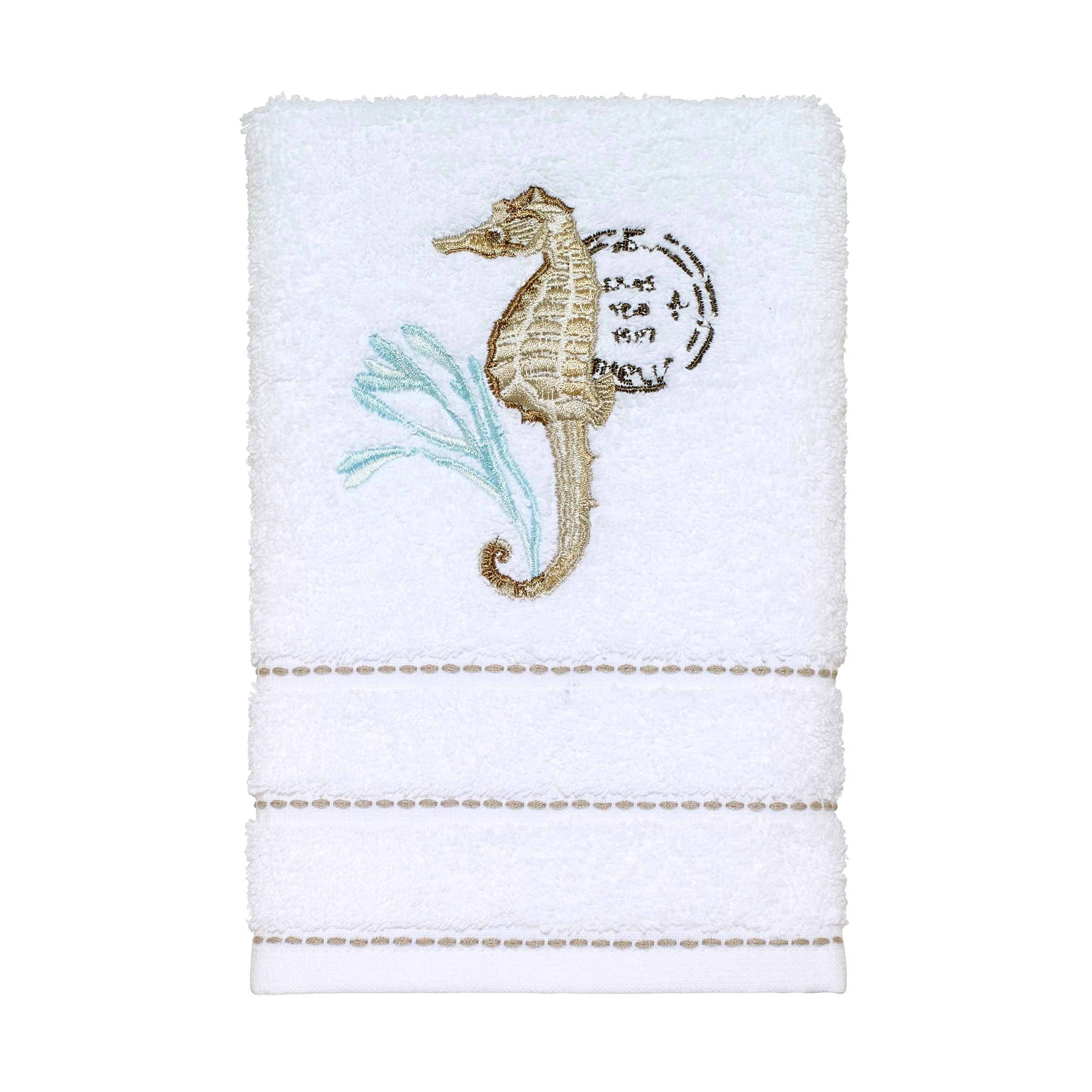The Avanti Farmhouse Shell Hand Towel is embroidered with shells, a postmark and cotton vine in light blue and beige on a 100% cotton white terry towel. The towel is bordered with 3 taupe broken horizontal polyester stripes. Imported.