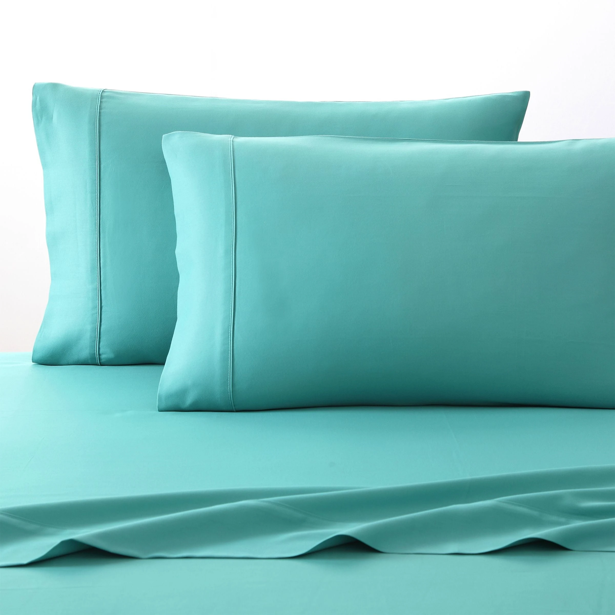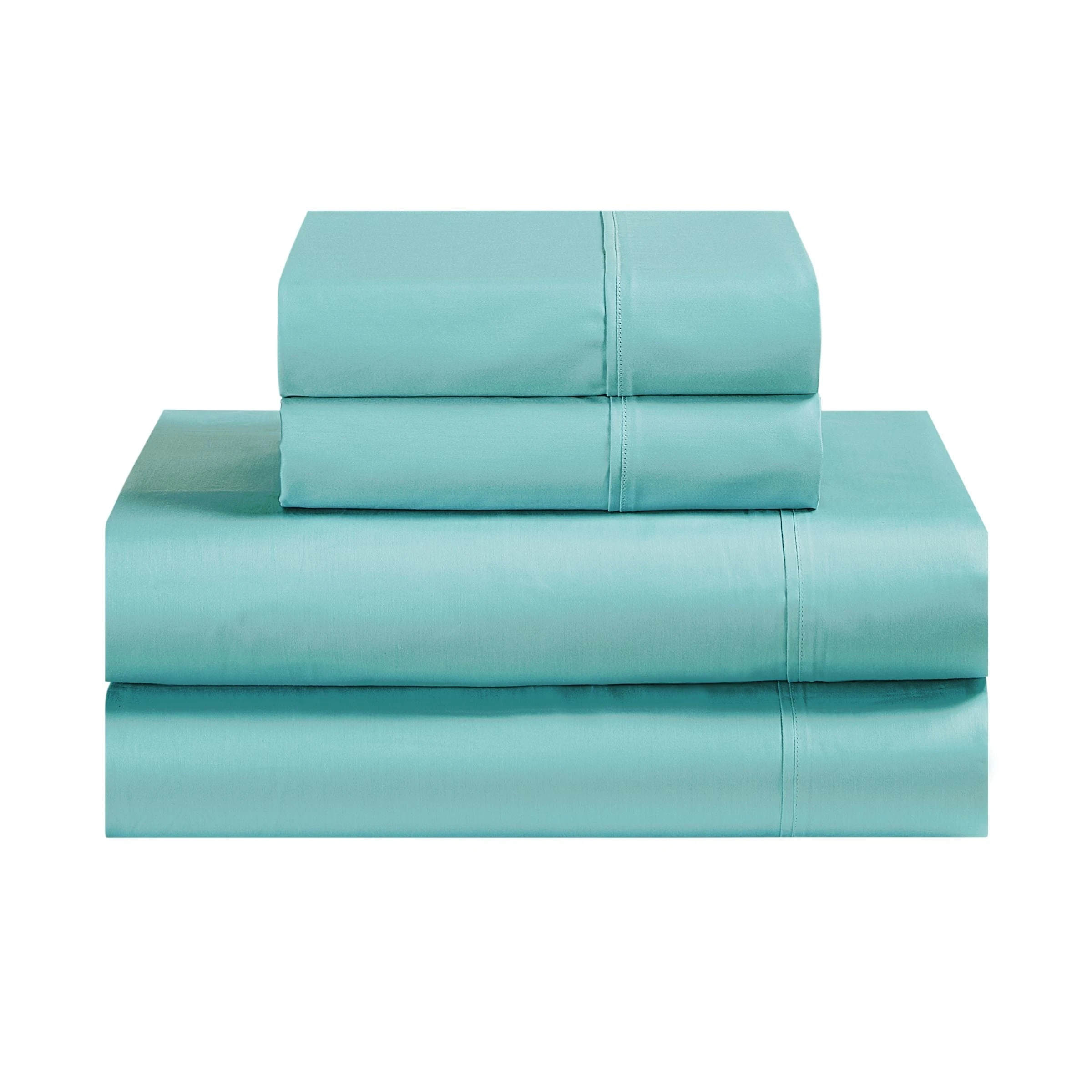 The Fiestaยฎ 300 Thread Count Sateen Turquoise King Sheet Set delivers a smooth, soft, silky feel. The single-ply 100% cotton sateen weave brings more of the threads to surface, giving that cool and lustrous finish. Set includes one flat and fitted sheet, 2 king pillow cases. Imported.