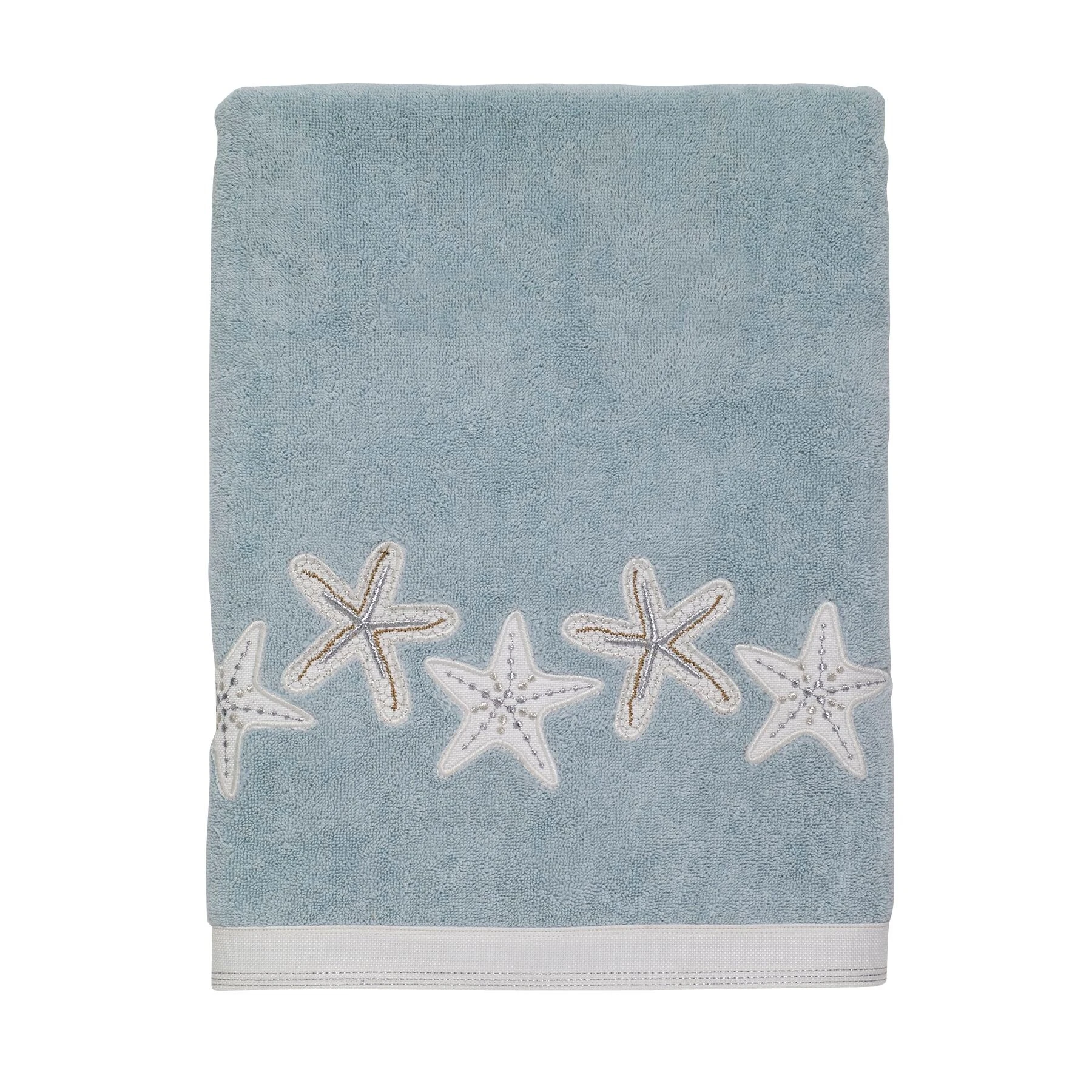 With beautifully embroidered starfish on white applique fabric and coordinating fabric border on a 100% cotton mineral terry towel, the Avanti Sequin Shells Bath Towel adds an understated touch of the sea to any bath dรฉcor.