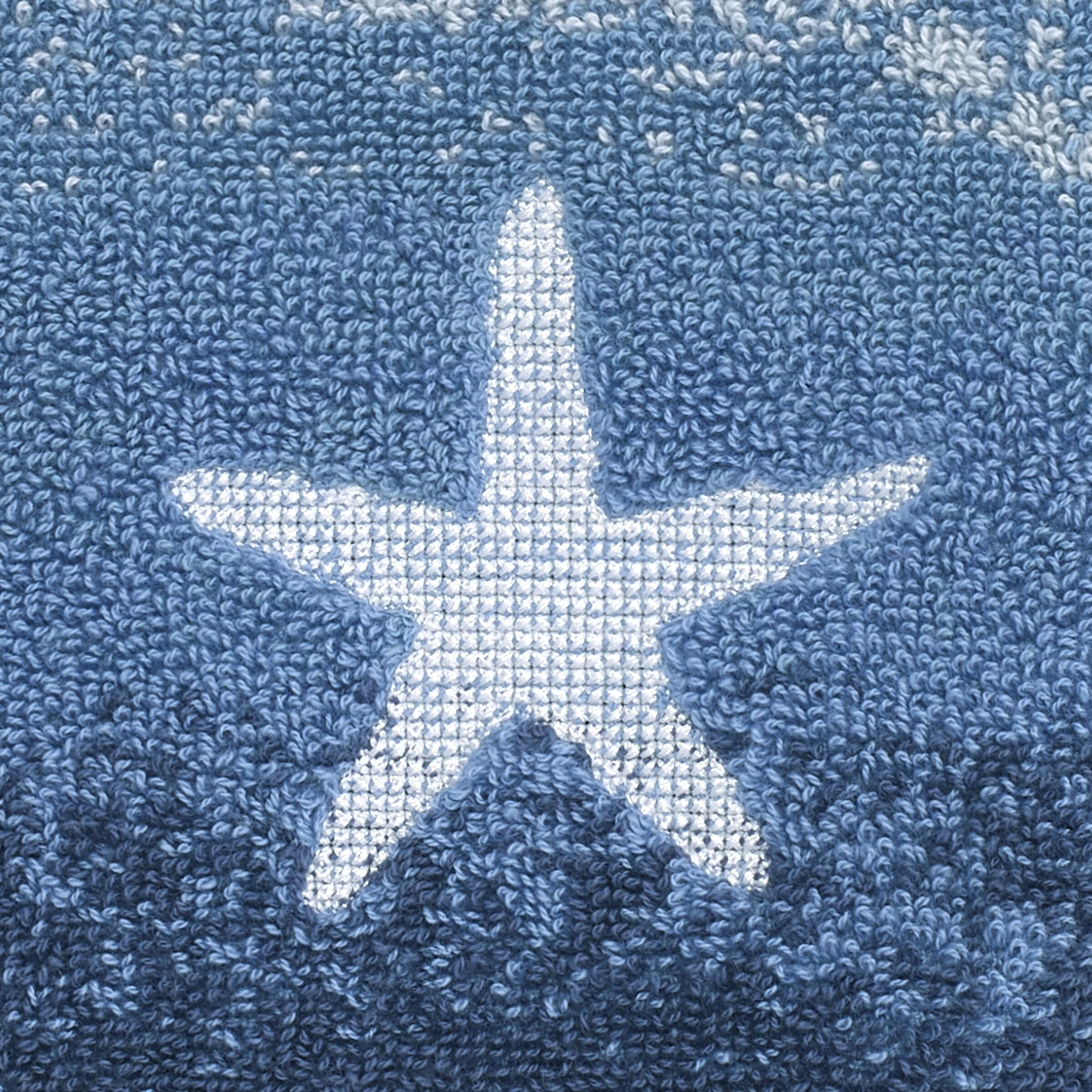 The ย ย Avanti Batik Coastal Fingertip Towel is decorated with embroidered ocean starfish, sand dollar-on an ombred navy ย ย blue-to-white jacquard ground. Terry towels made of 100% ringspun cotton. Set ย ย includes 1 each of bath, hand and fingertip towel. Imported. ย ย ย ย