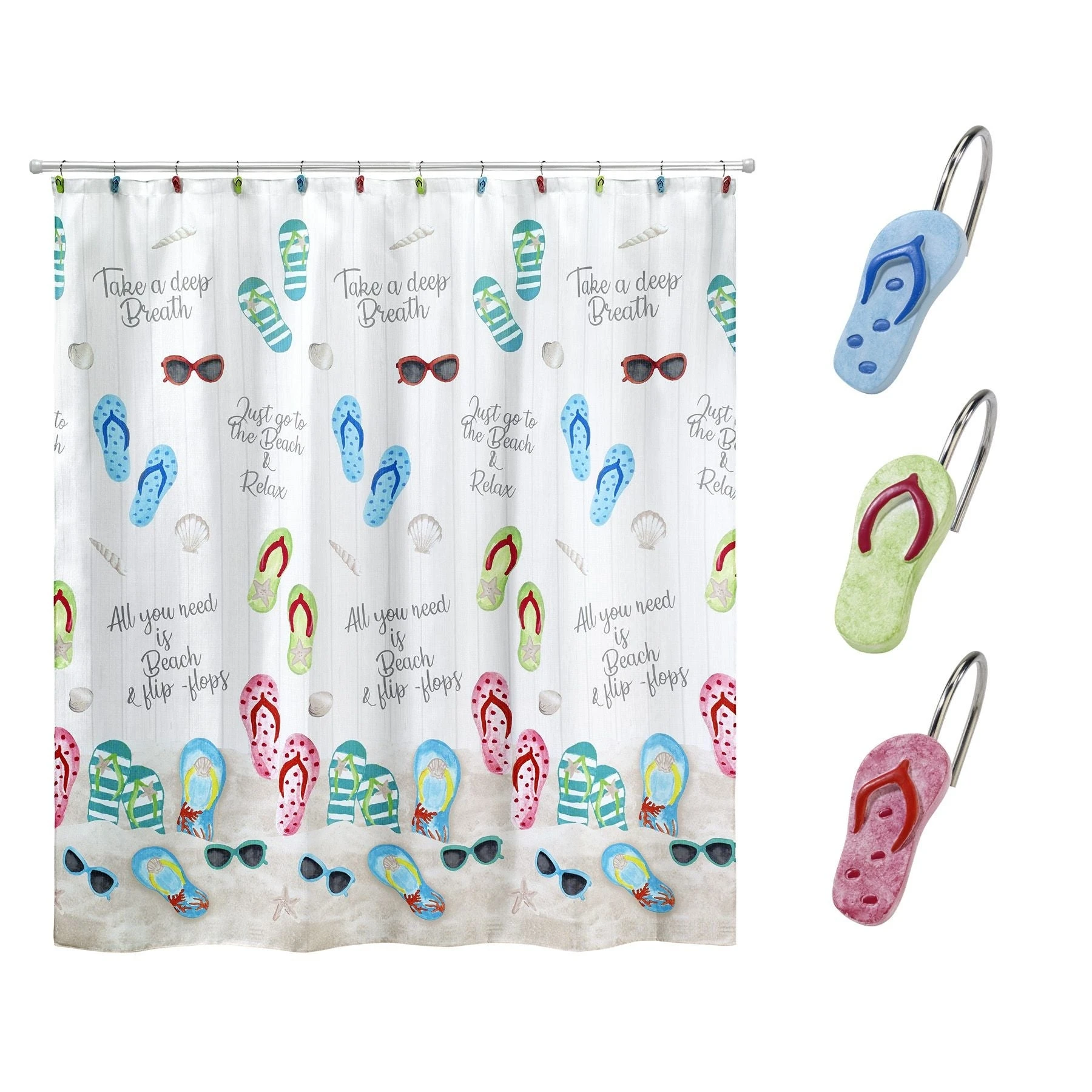 The Avanti Beach Mode Collection 13-Piece Shower Curtain and Hook Set is decorated with beach sayings, flip-flops and sunglasses on a white 100% polyester shiplap ground, 72 x 72 in. The hooks feature 3 different flip-flops, made of hand-painted resin. Set includes 1 curtain and 12 hooks. Imported.
