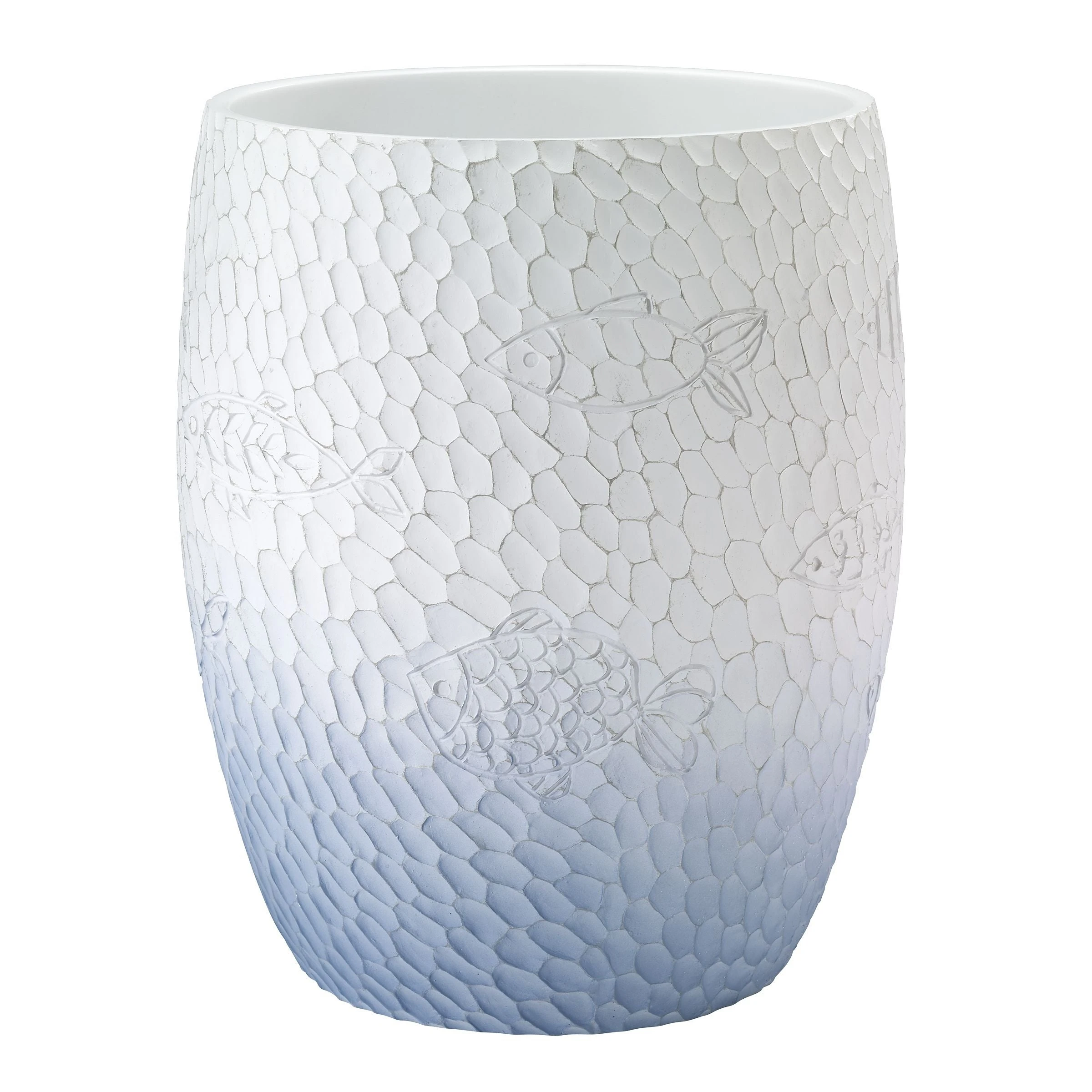 The Avanti Blue Fin Bay Round Wastebasket is decorated with embossed primitive-looking fish swimming around the piece. Starting with a medium blue bottom, the color lightens as it moves up to the top finishing in a light blue. Made of durable, hand-painted resin, 10″ high x 8″ wide.