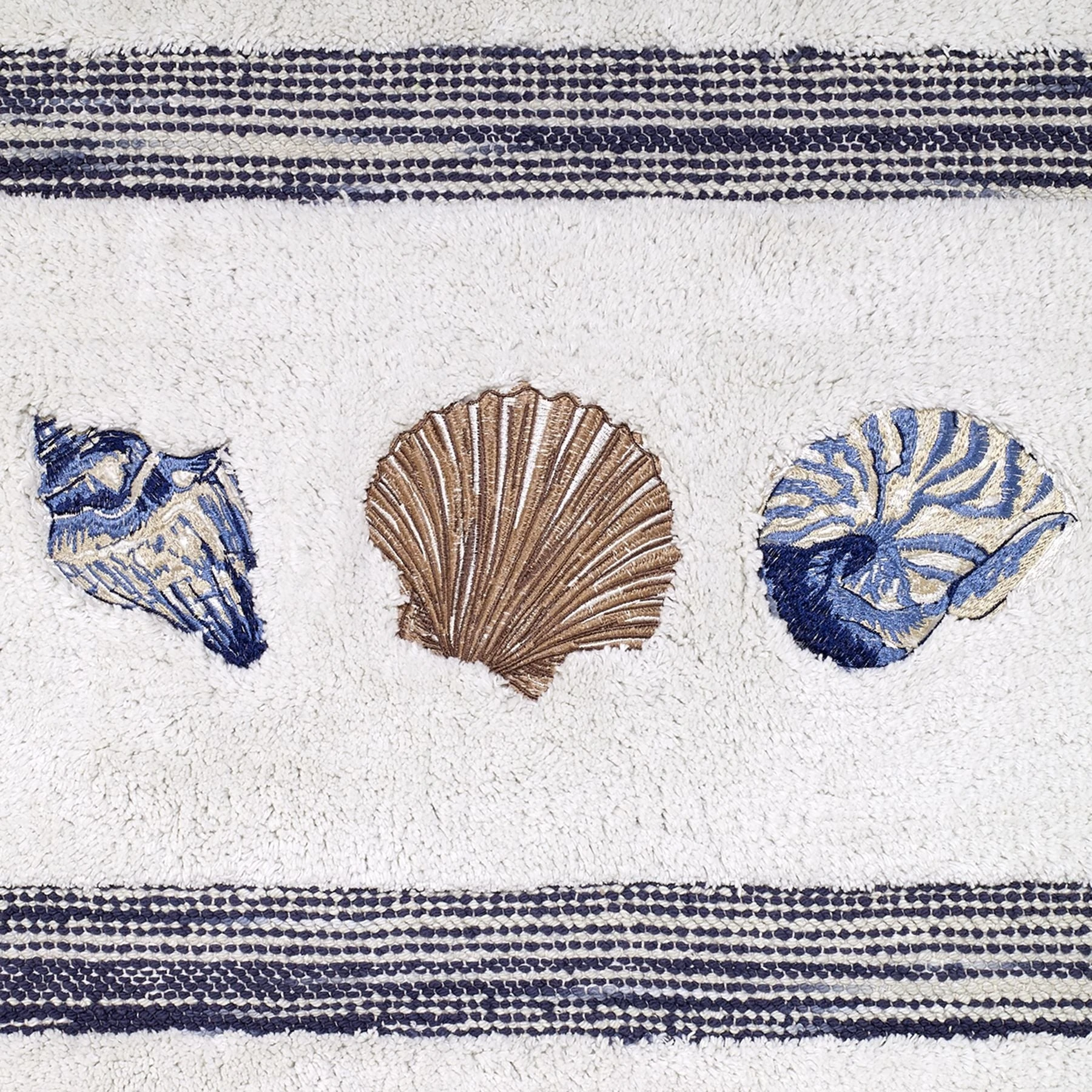 The Avanti Blue Lagoon Rug is tufted in 100% cotton and embroidered with a conch shell, fan shell and nautilus. It’s bordered top and bottom with a variegated blue stripe and finished on the sides with a ball fringe. The rug is skid resistant and machine washable.
