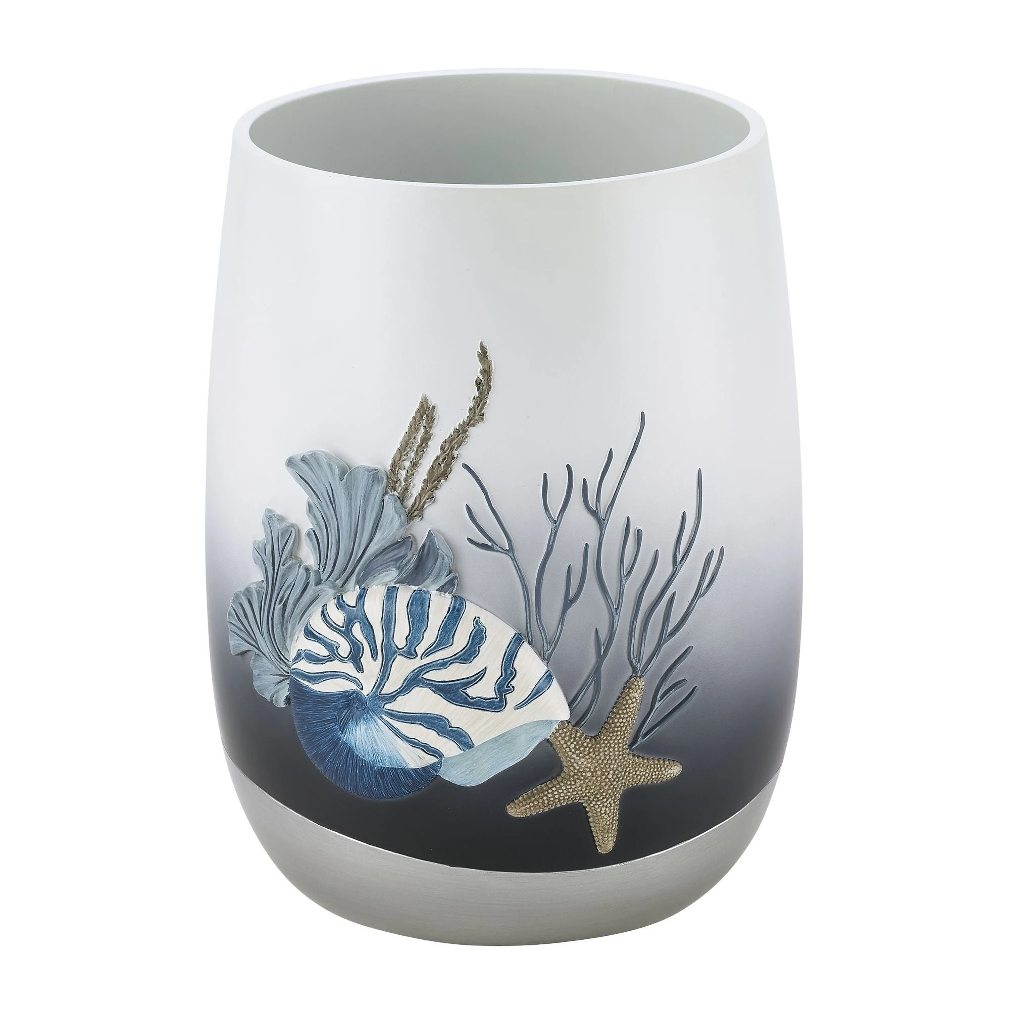 The Avanti Blue Lagoon Wastebasket is decorated with raised starfish, shells and coral in shades of blue and beige on an ombre base that goes from off-white to dark blue. A contrasting silver border adorns the bottom. Made of durable resin, hand painted. Imported.