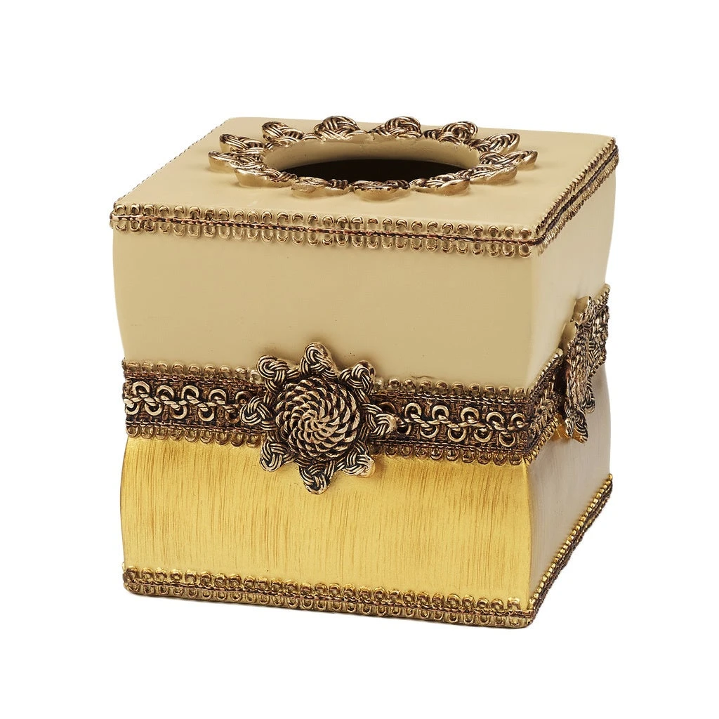 Have an issue? Take a tissue! But this time, do it in style! This braided medallion tissue box cover features a classic braid and medallion motif on this stunning tissue cover, colored in ivory and gold. The resin construction ensures durability.