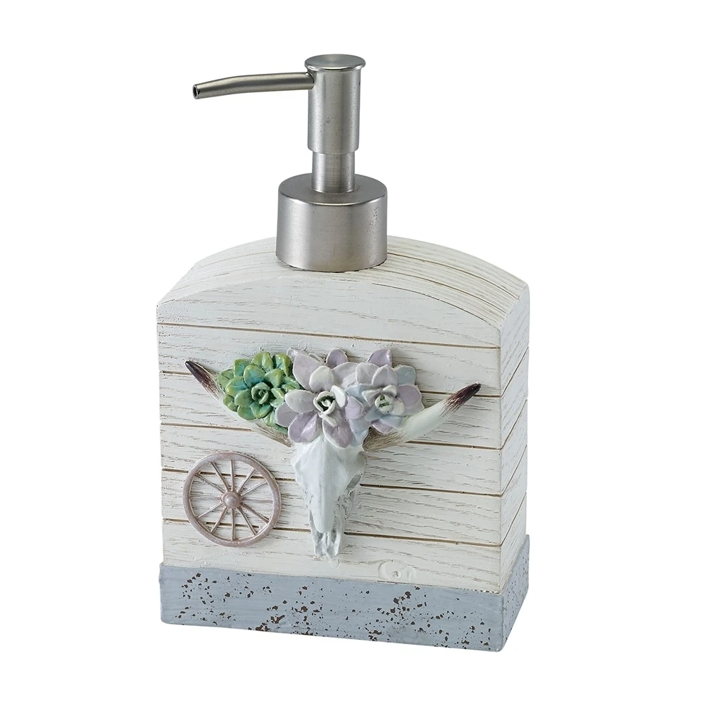 The Avanti Canyon Lotion Dispenser features a textured off-white wood-grained ground decorated with a Saguaro cactus in bloom and desert flowers in green, lilac and blue, crafted in life-like dimensional detail. The piece sits in a textured aloe-blue base with brown splattered accents. Brings a touch of the southwest to any bathroom or kitchen. Coordinating shower curtain, rug and towels also available. Made in resin, imported.