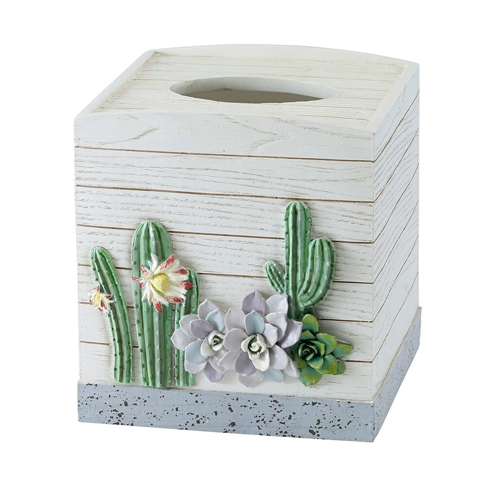 The Avanti Canyon Tissue Cover features a textured off-white wood-grained ground decorated with a Saguaro cactus in bloom and desert flowers in green, lilac and blue, crafted in life-like dimensional detail. Adds a touch of the southwest to any bathroom, kitchen, bedroom or office. The piece sits in a textured aloe-blue base with brown splattered accents. Coordinating shower curtain, rug and towels also available. Made in resin, imported.