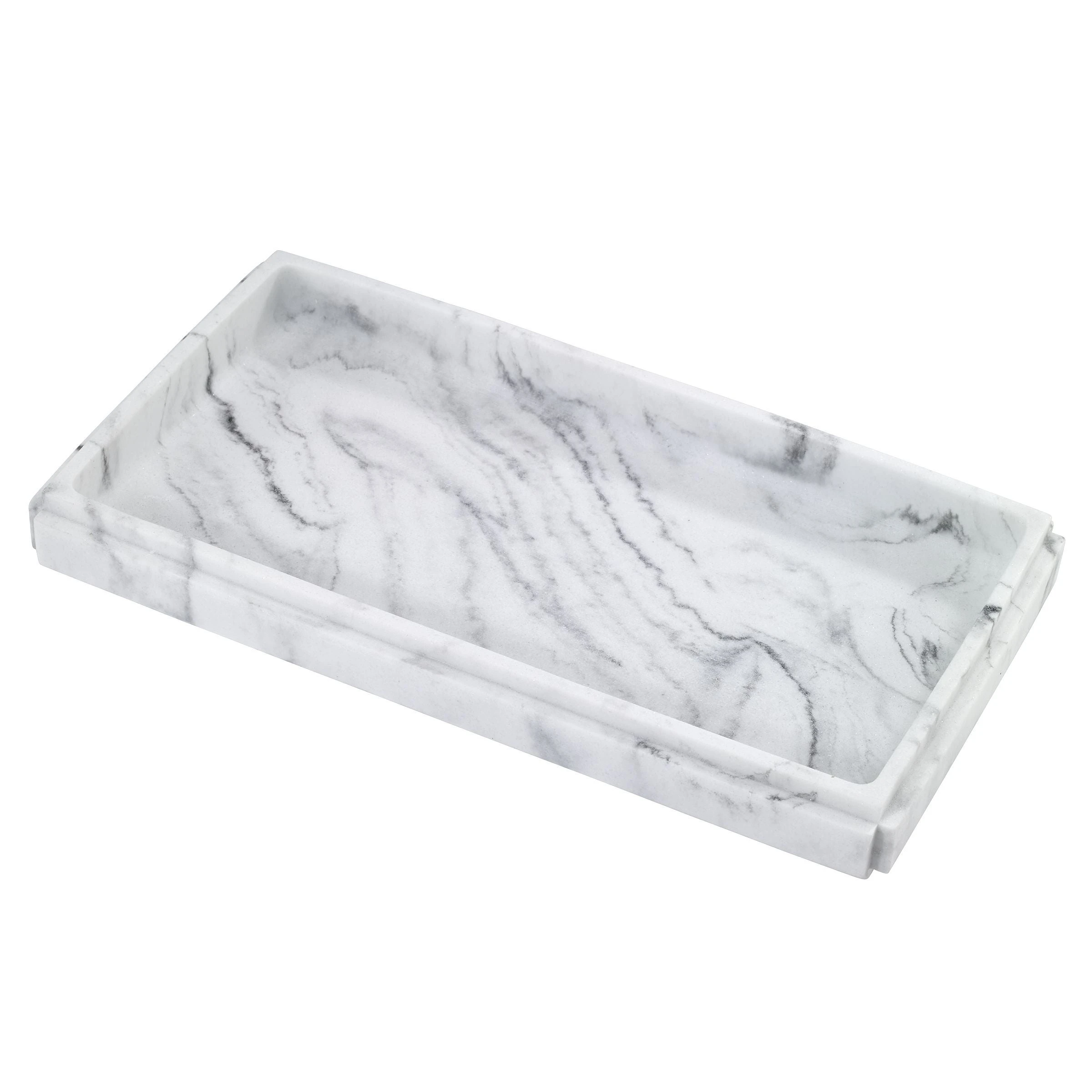 The Avanti Catania Tray features a grey and white marble look in a contemporary, geometric shape. Perfect for the bathroom, kitchen, office or any room in the house-great combination of form and function. Made of durable resin for long-lasting use, 10″ W x 5.5″ D x 1″ H.