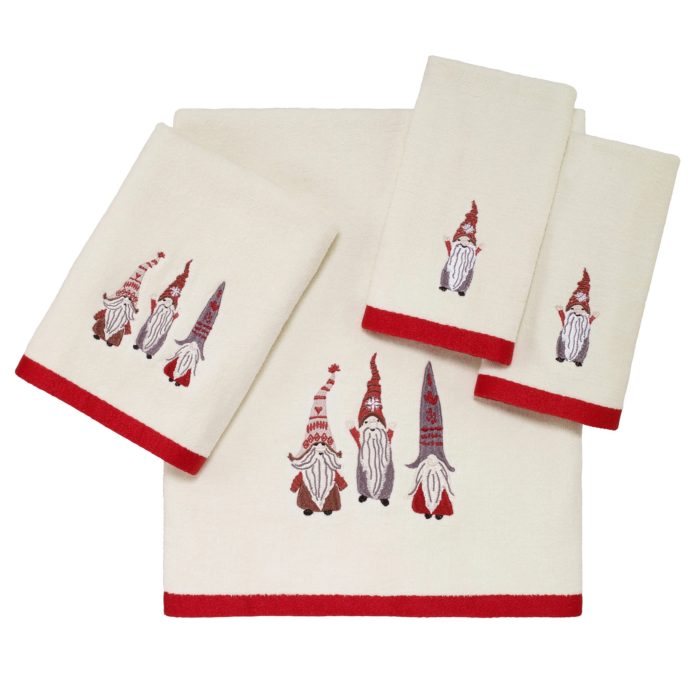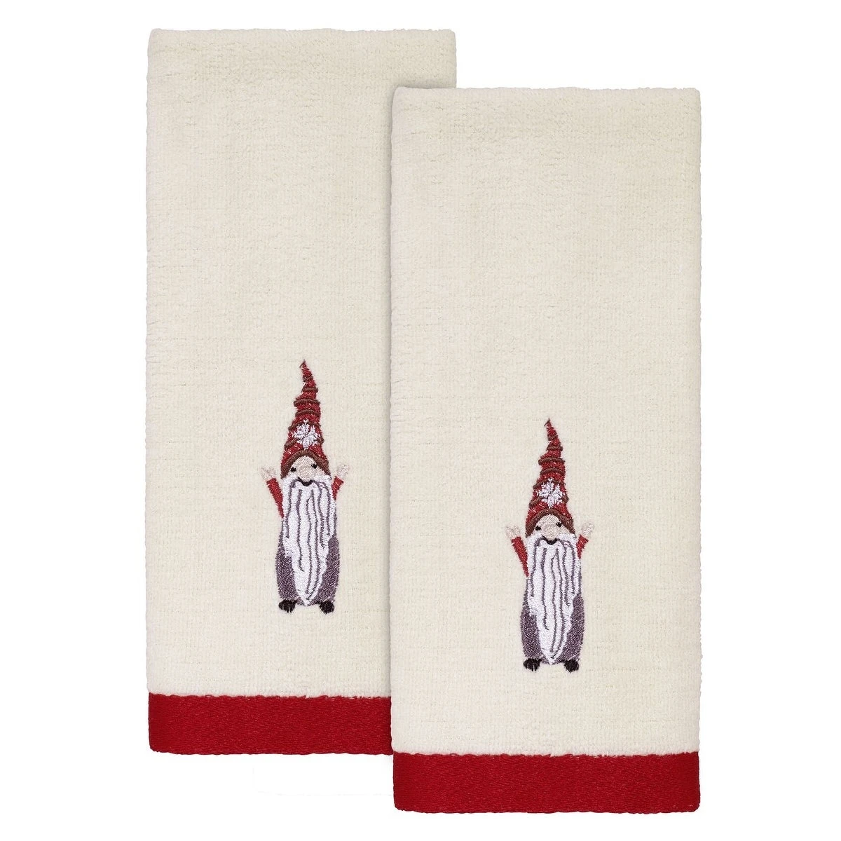 The Avanti Christmas Gnomes 2-Pack of Fingertip Towels feature an embroidered festively dressed gnome on a 100% cotton (exclusive of embellishment and border) ivory velour towel. Towel is finished with a coordinating red polyester border. Imported.