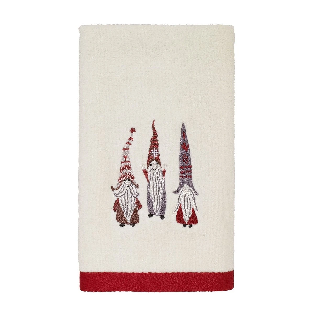The Avanti Christmas Gnomes Hand Towel features 3 embroidered festively dressed gnomes on a 100% cotton (exclusive of embellishment and border) ivory velour towel. Towel is finished with a coordinating red polyester border. Imported.