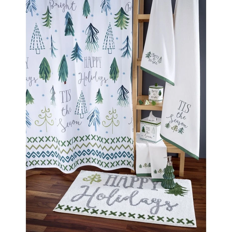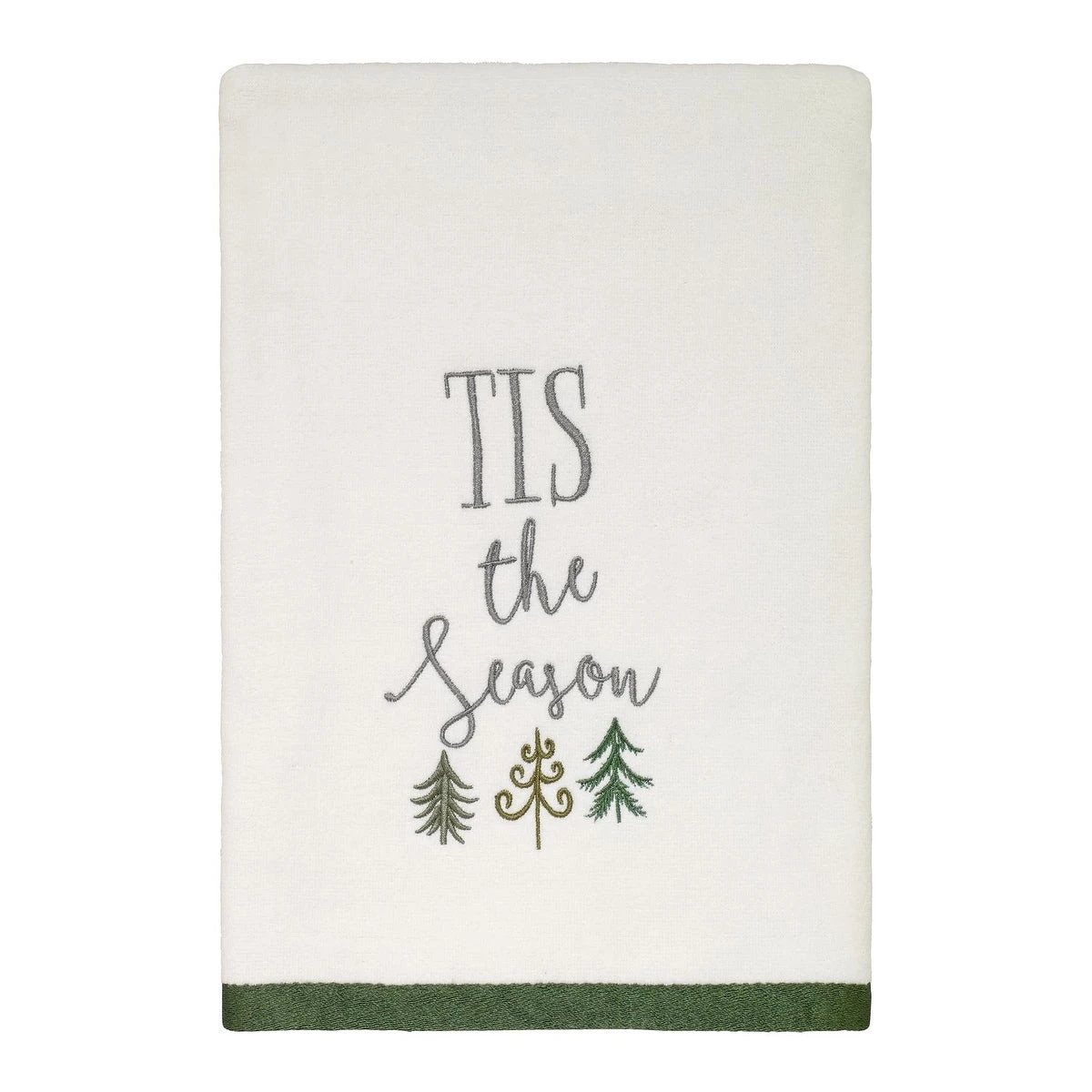 The Avanti Christmas Trees Bath Towel features “Tis the Season” and a series of whimsical Christmas trees embroidered on a 100% cotton (exclusive of embellishment and border) white velour towel. The towel is finished with a green polyester border. Imported.