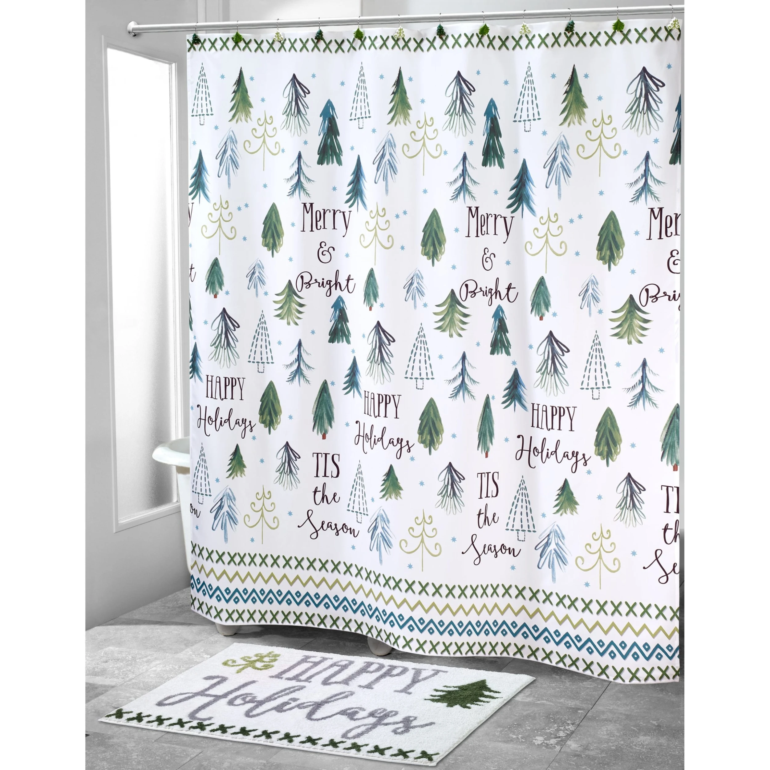 The Avanti Christmas Trees Rug features “Happy Holidays” tufted in grey with 2 whimsical Christmas trees and an “X” border in black on a white ground. 20″ x 30″. 100% polyester. Imported.