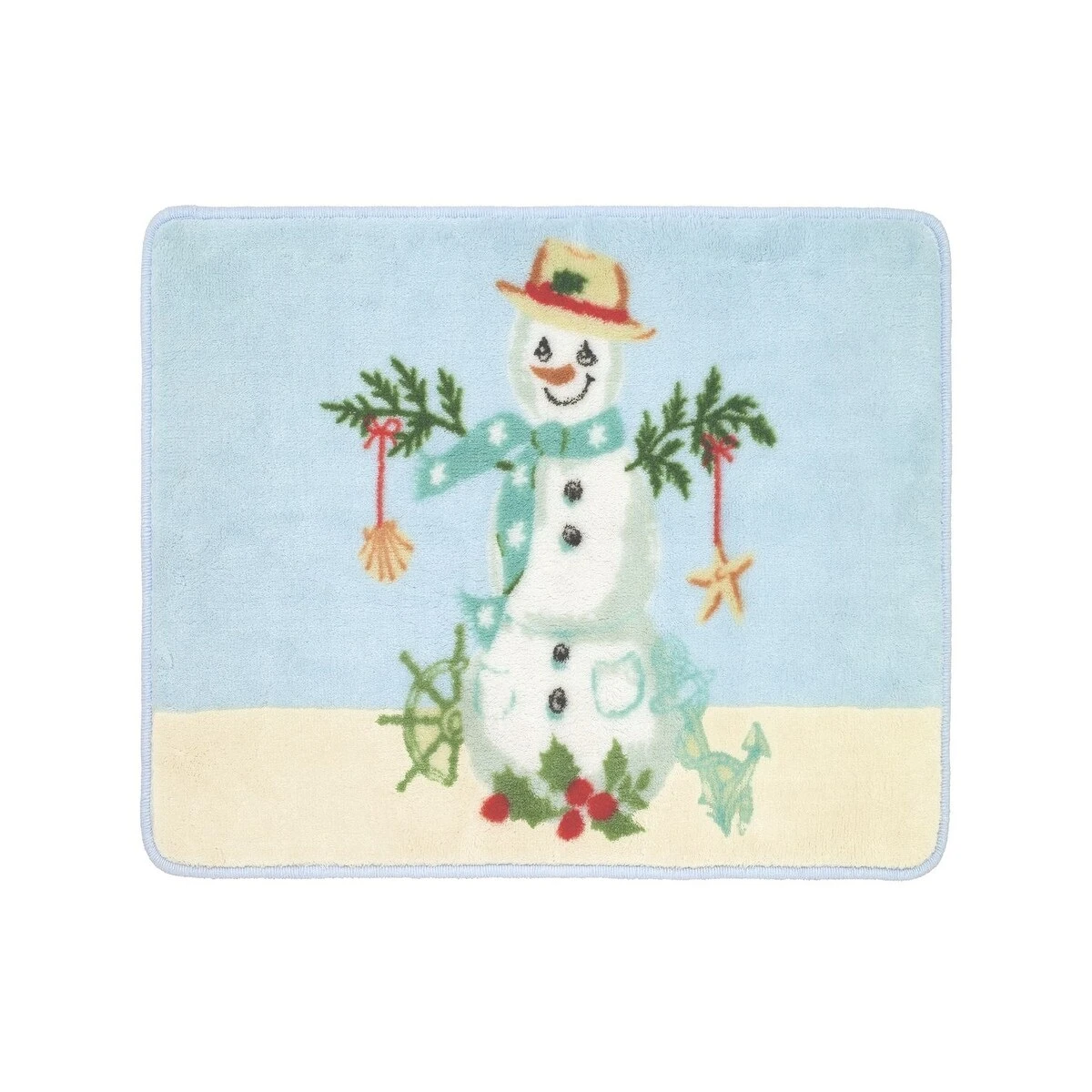 The Avanti Coastal Snowman Rug features the smiling snowman with a straw hat, blue polka-dotted scarf and holly with seashells, a starfish and ship’s wheel. The background is beige at the bottom and sky blue at the top. 20″ x 30″, printed on 100% polyester. Imported.