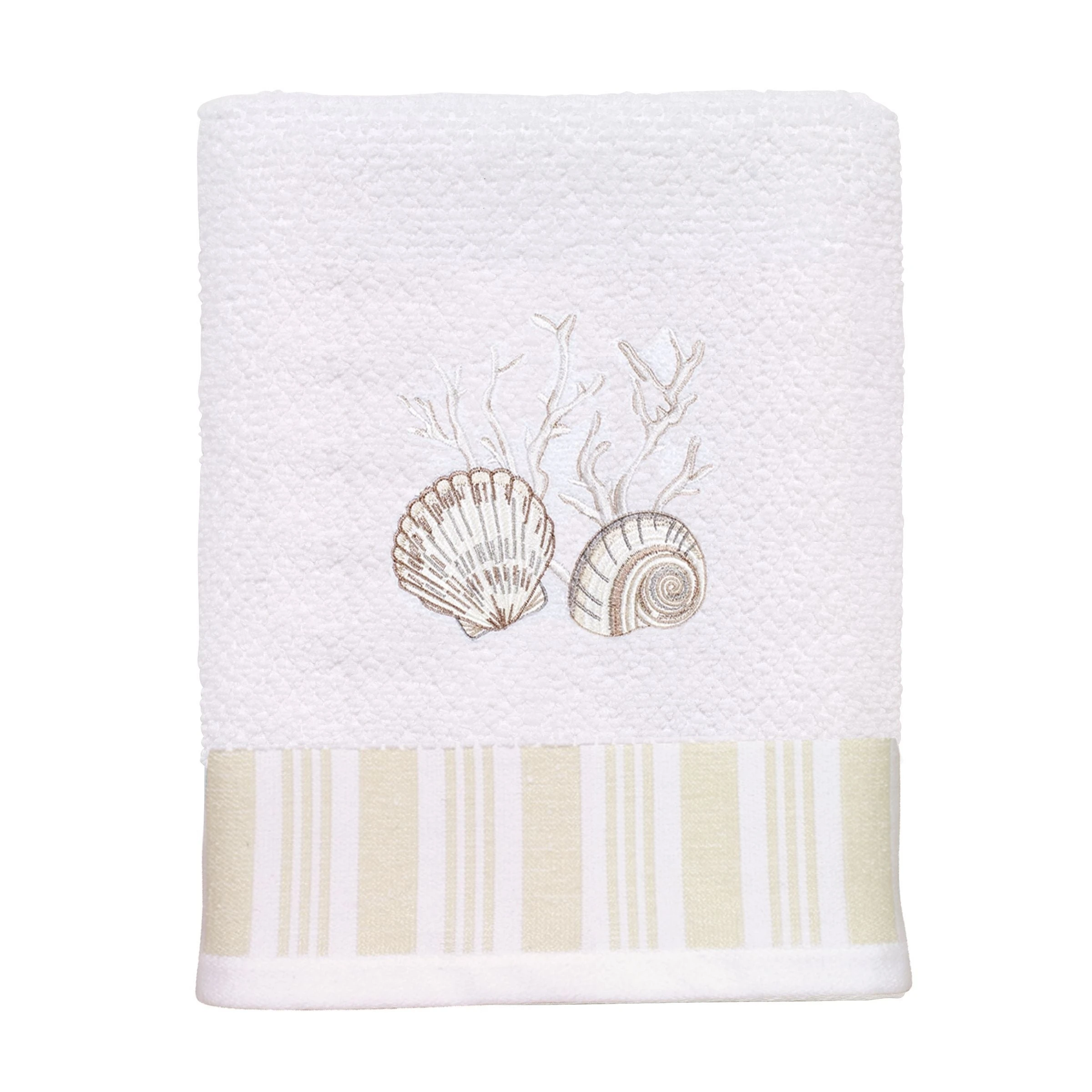 The Avanti Destin Hand Towel features a beautifully embroidered shell and coral design in grey and beige tones on a 100% cotton terry towel. The towel is finished with a beige and white vertical striped border. Imported.