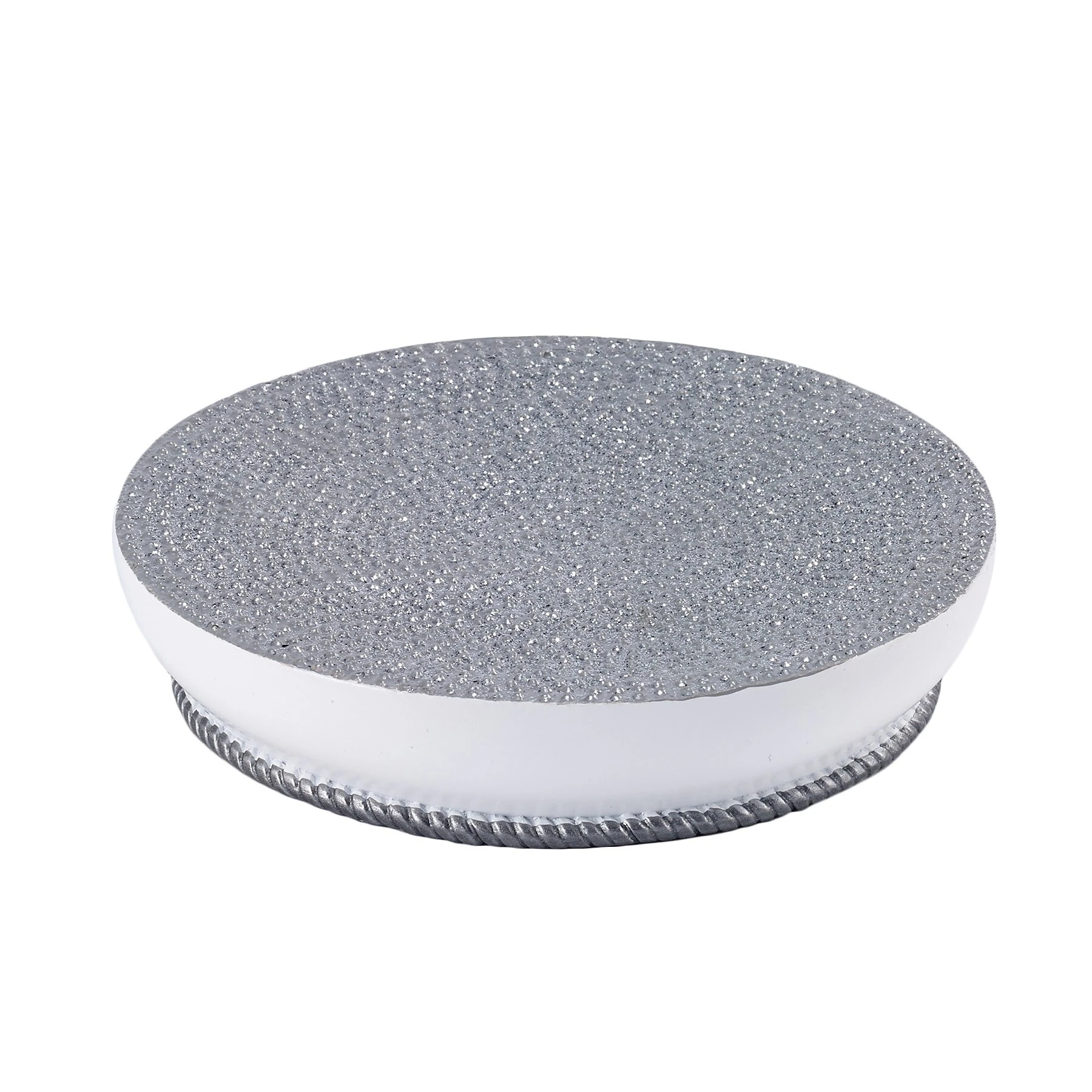 Beautifully executed in grey and blue with metallic accents on a white base in durable resin, the Avanti Dotted Circles Soap Dish adds a contemporary flair to any bathroom or kitchen. Coordinating shower curtain, rug and towels also available. Imported.