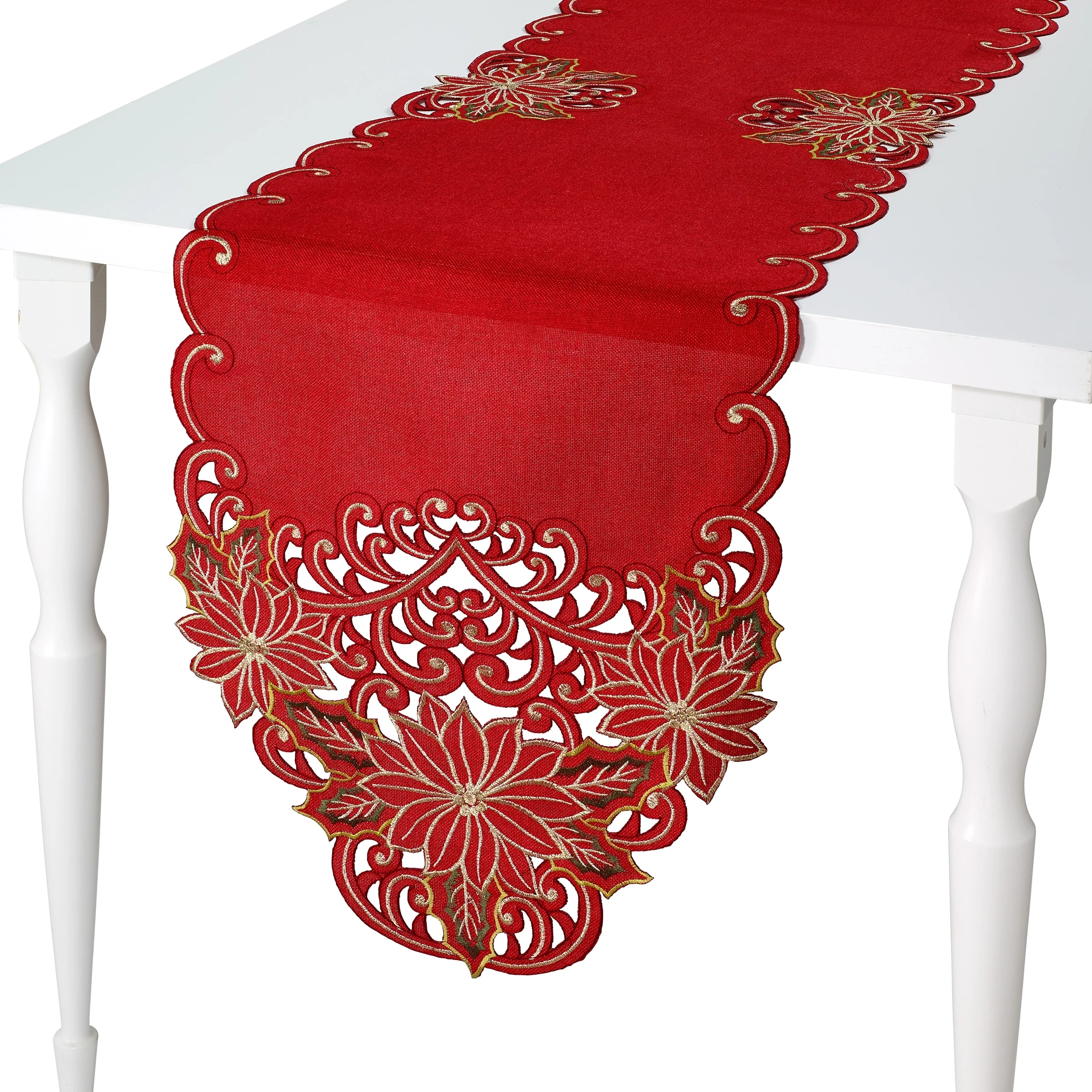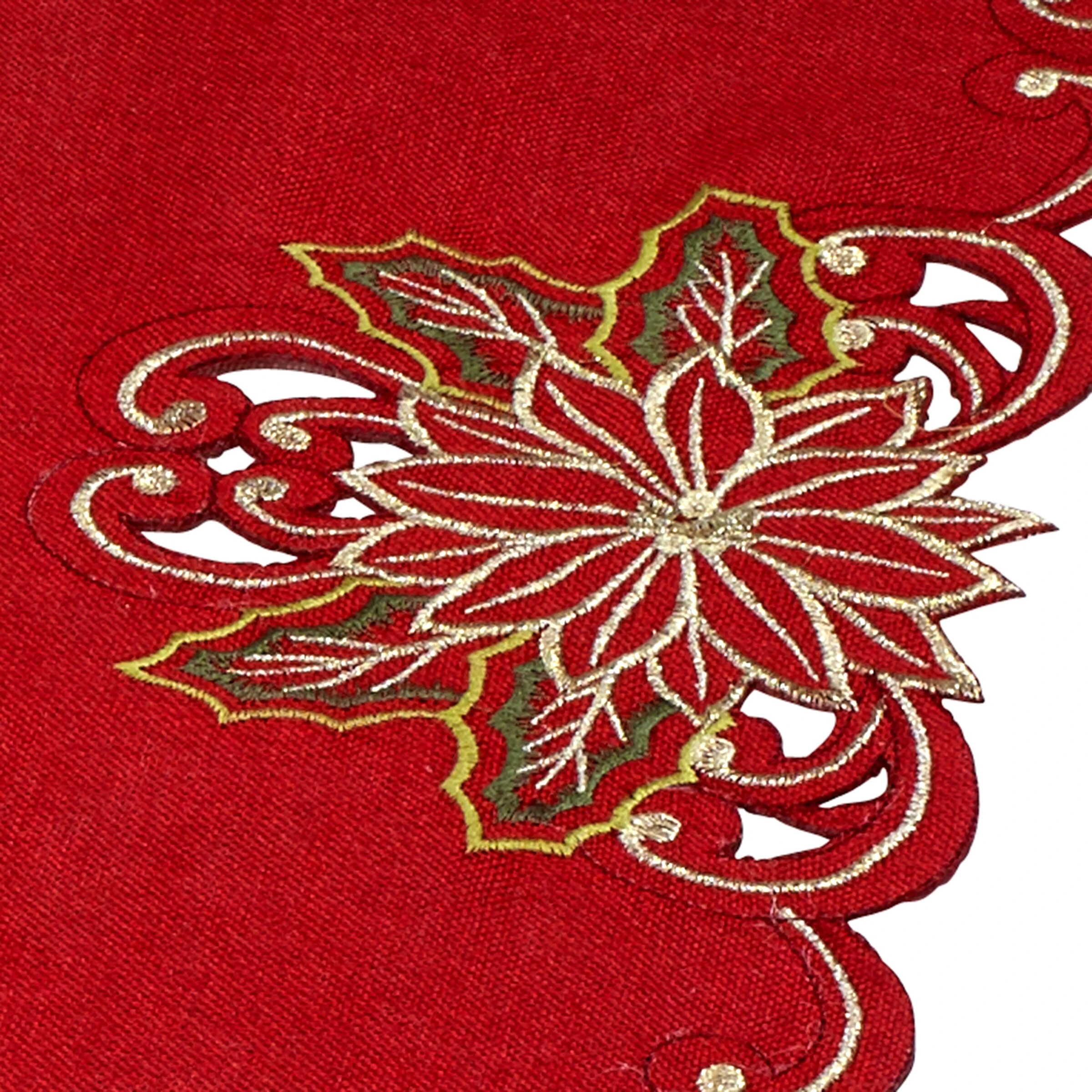 The Avanti Floral Medallion Christmas Table Runner features a festive, colorful holiday design on a red ground with ivory, blue and green embroidery. The runner is scalloped on all sides for a decorative finishing touch. Oversized at 16″ x 72″, 100% polyester. Imported.