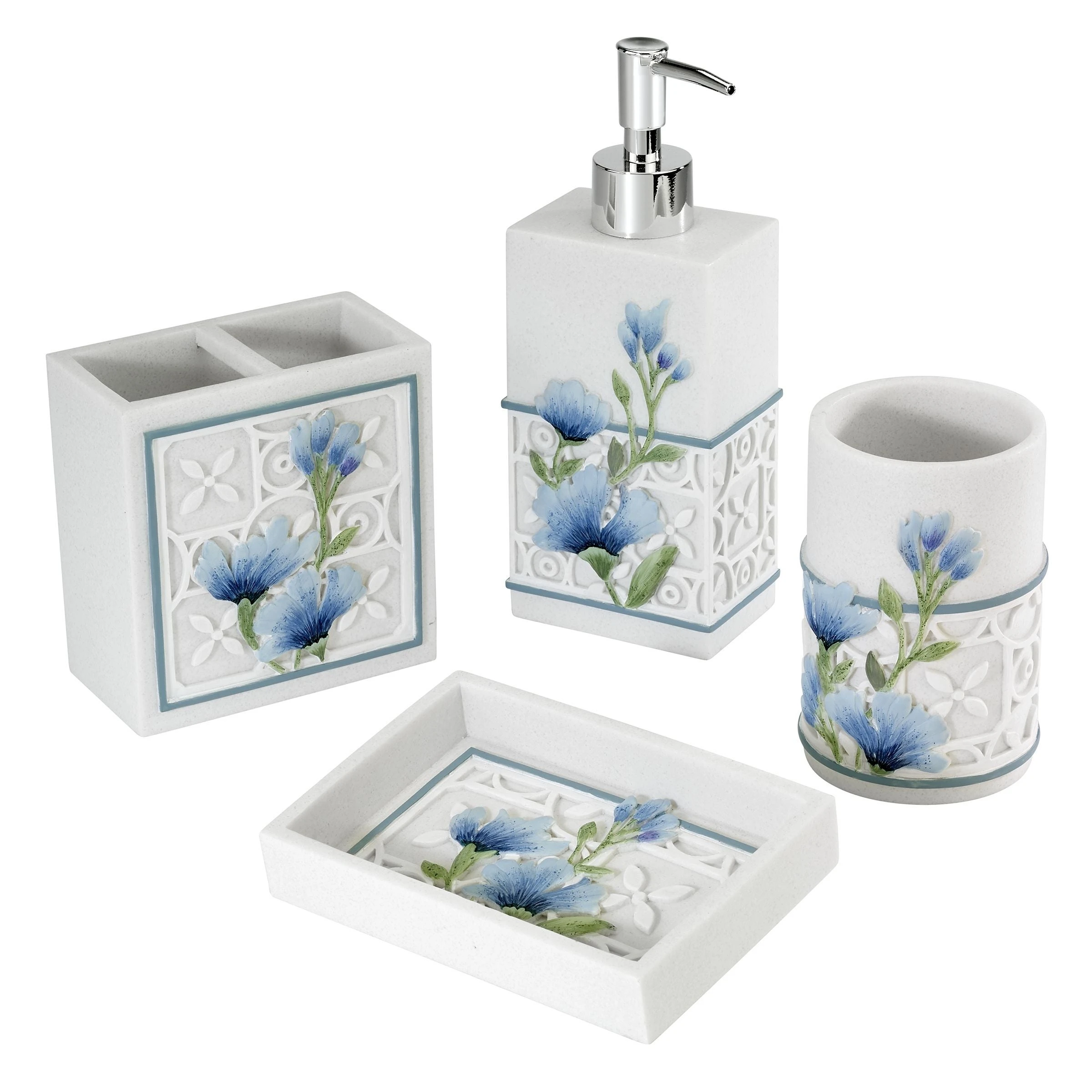 The Avanti Garden View Collection 4-Piece Accessory Set features fresh spring blossoms in shades of blue with green stems on a white, debossed trellis design. Realistically made in hand-painted resin. Set includes 1 each of tumbler, toothbrush holder, soap dish, lotion dispenser. Imported.