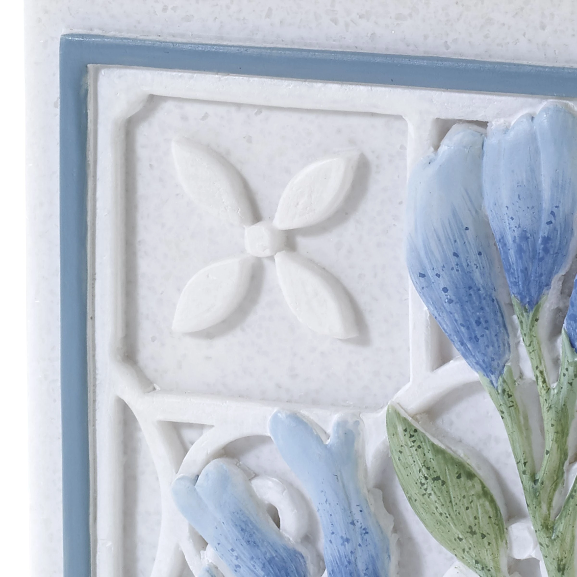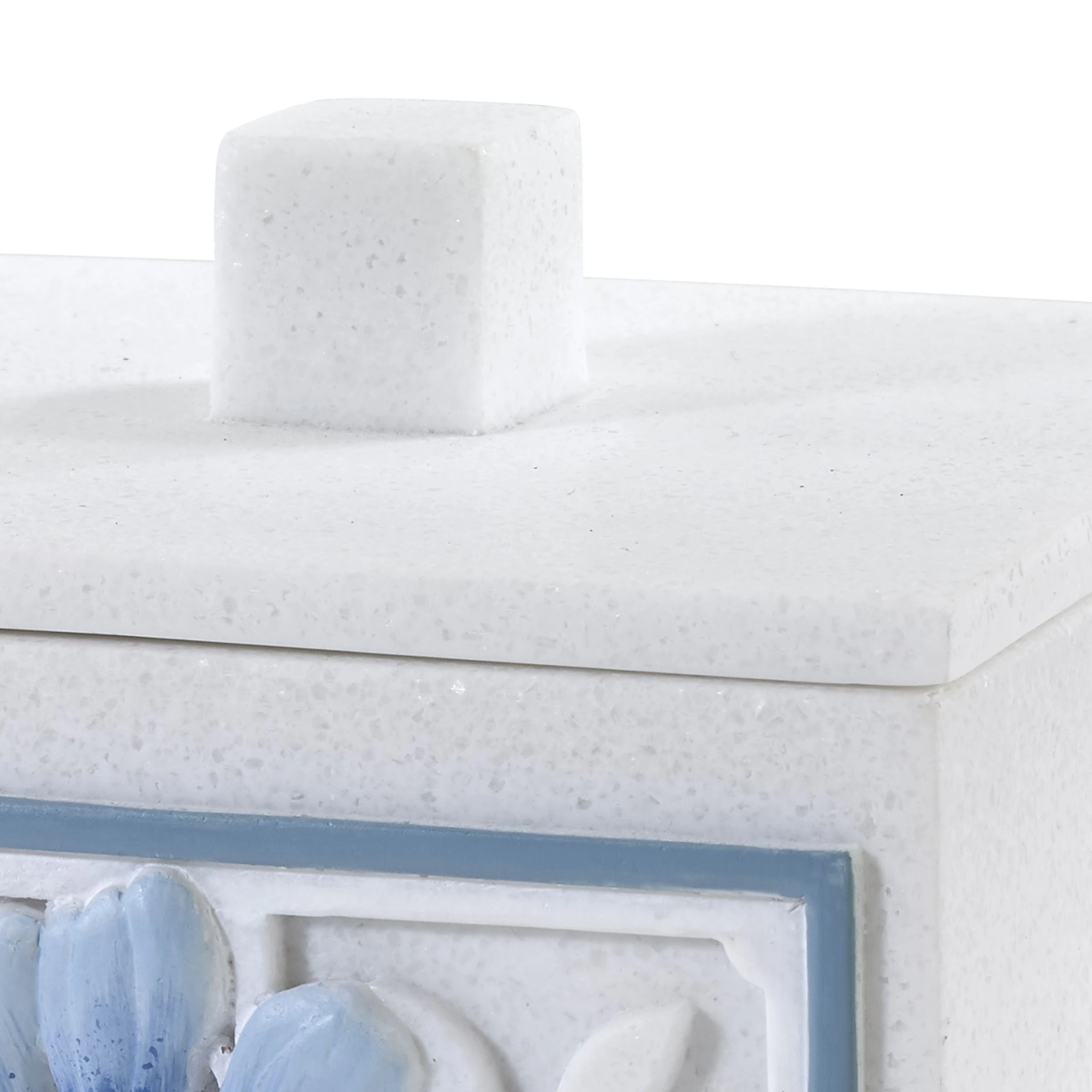 The Avanti Garden View Collection Covered Jar features spring blossoms in shades of blue with green stems on a white, debossed trellis design and a medium blue border. Made of hand-painted resin, with fitted cover. Coordinating shower curtain, accessories, towels and rug available. Imported.