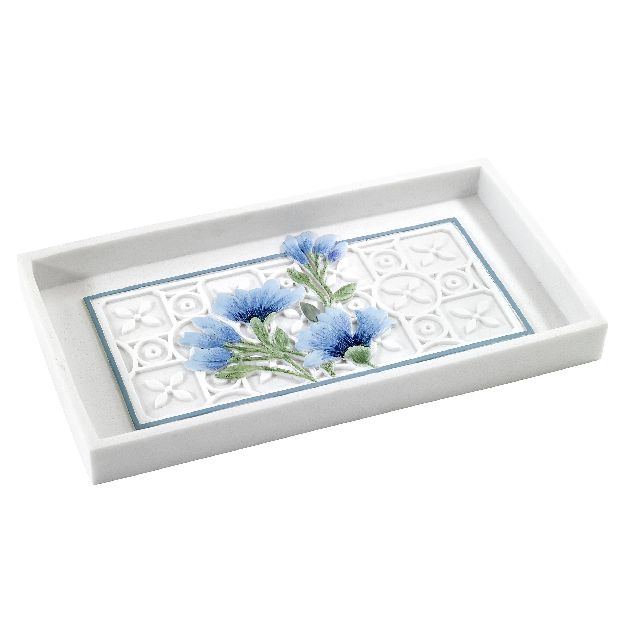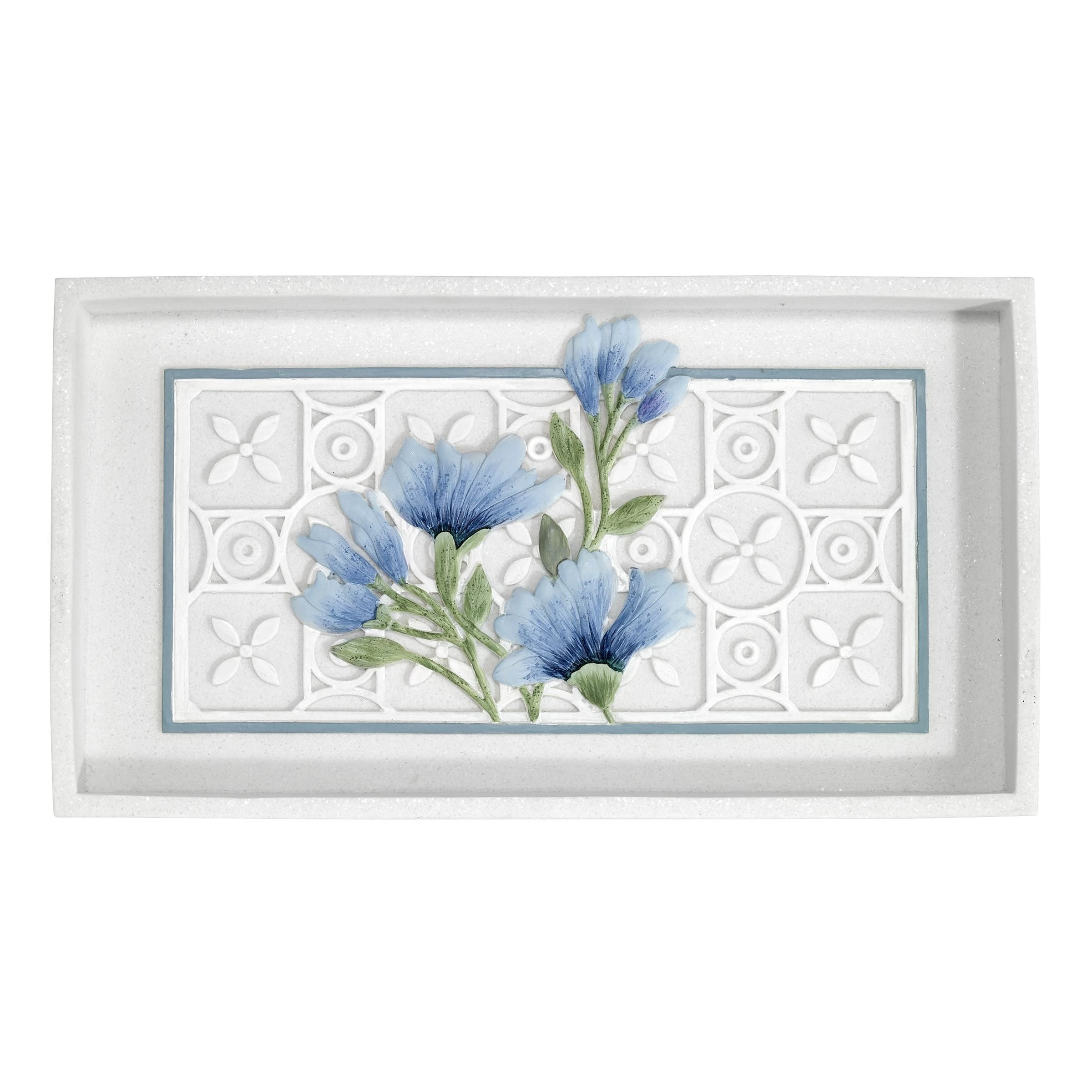 The Avanti Garden View Collection Tank/Countertop Tray features spring blossoms in various shades of blue with green stems on a white, debossed trellis design framed with a medium blue border. Realistically created in hand-painted resin, 5.6 x 10 in. Coordinating pieces available. Imported.