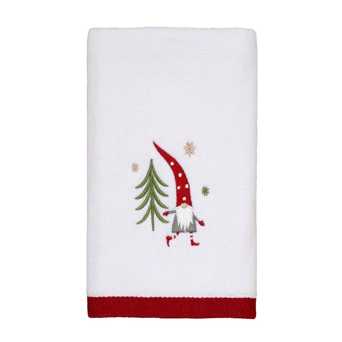 The Avanti Gnome Walk Decorative Hand Towel is embroidered with an adorable gnome with a big, whimsical red hat and long white beard. The 100% cotton white towel has a contrasting red polyester border. Imported.