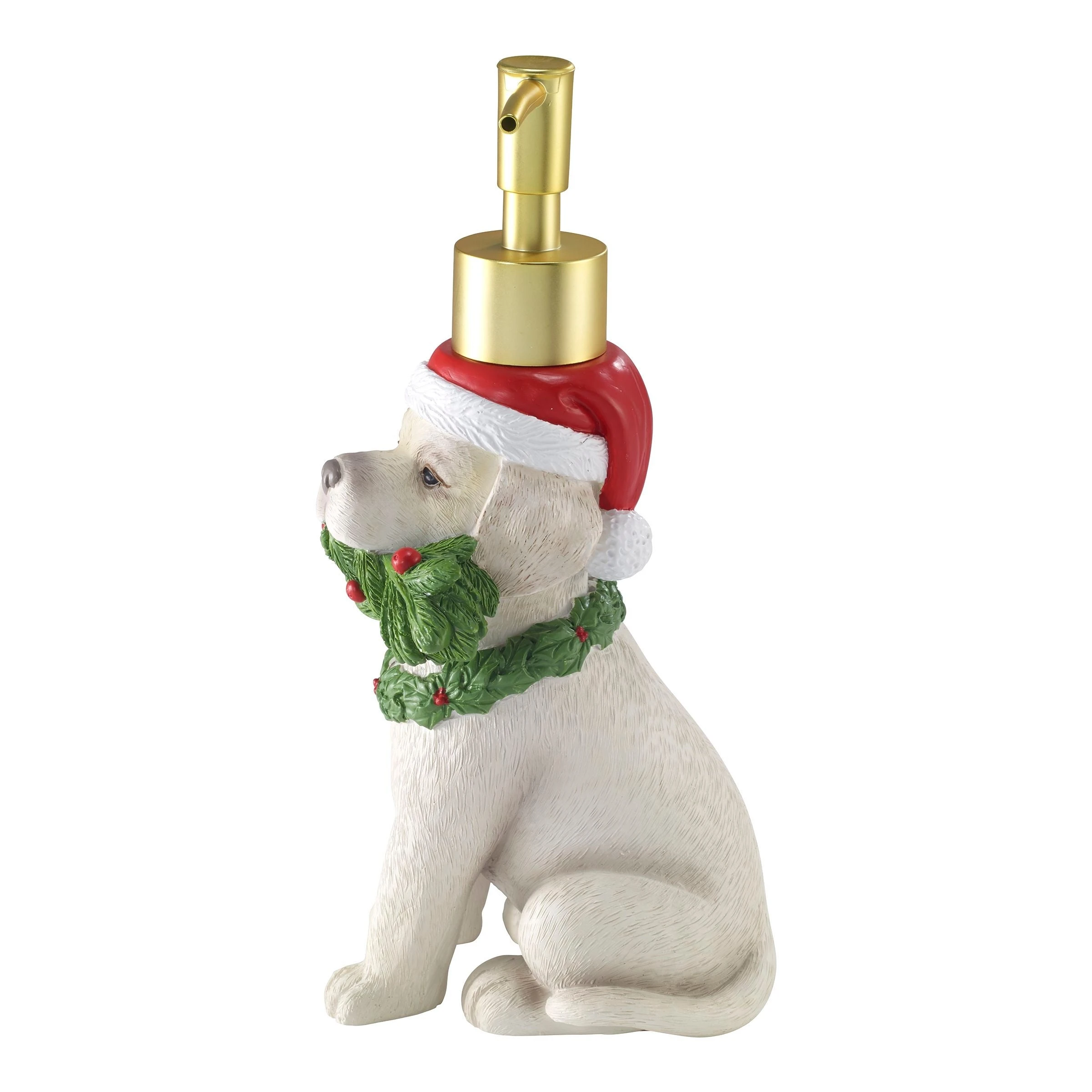 The Avanti Golden With Branch Lotion/ Soap/ Sanitizer Dispenser is an adorable Golden Retriever puppy with Santa hat and pine tree branch in his mouth. Made of durable, hand-painted resin, measures 8.1″ H x 3.2″ W x 3.3″ D. Great addition to any bathroom, kitchen or office.