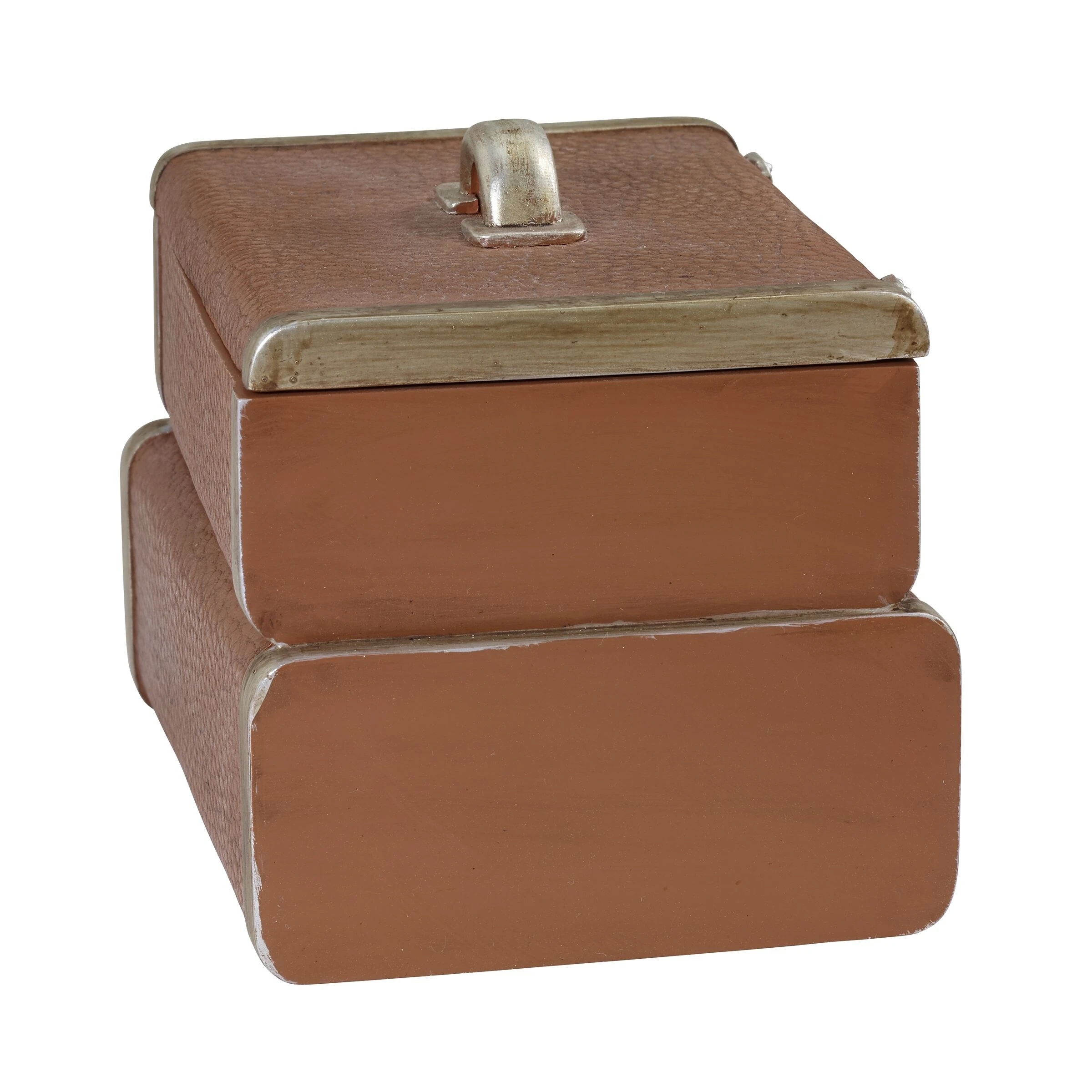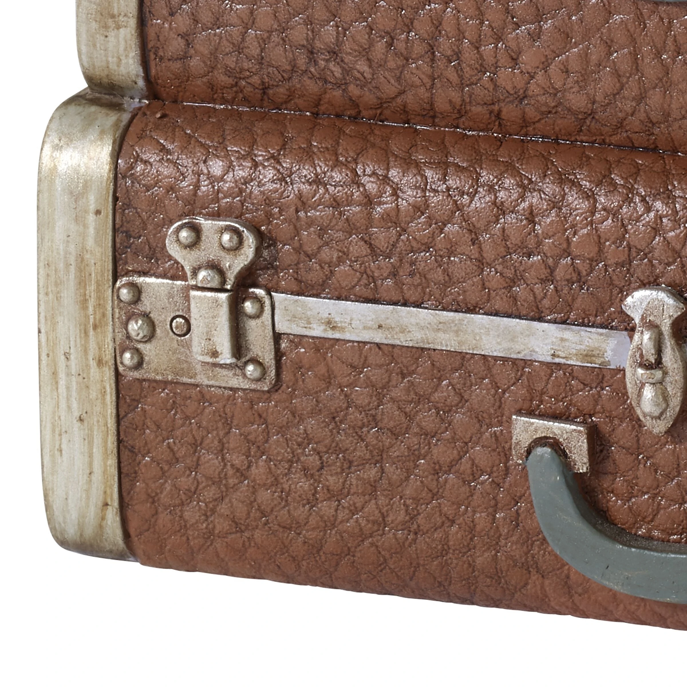 The Avanti Gone Glamping Collection Covered Jar recreates 2 brown suitcases stacked with a fitted lid. Crafted in great detail in hand-painted resin. Fully coordinating bath accessories, shower curtain, towels and rug also available. Imported.