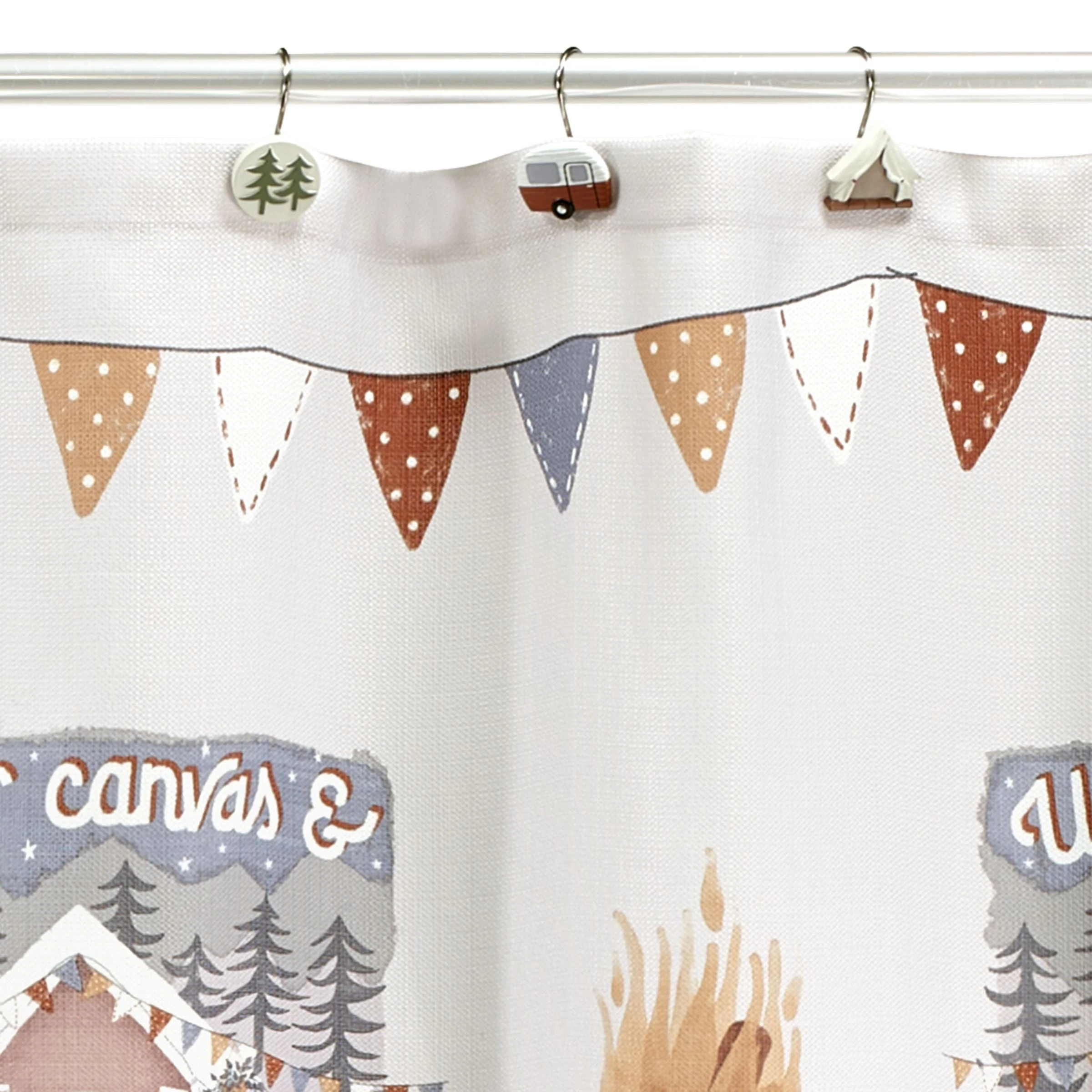 The Avanti Gone Glamping Collection Shower Curtain is decorated with camping icons-campfire, campers, tents, Adirondack chairs, pine trees and camping sayings. The bottom is bordered with a coordinating plaid. Printed on 100% polyester, 72 x 72 in., coordinating pieces available. Imported.