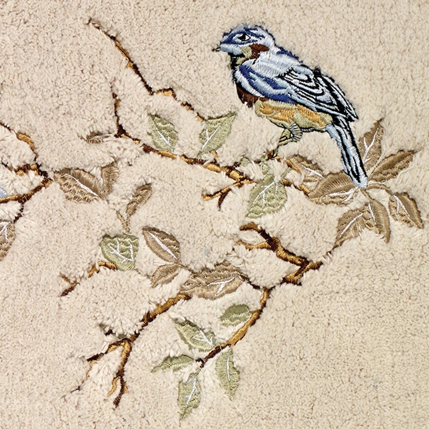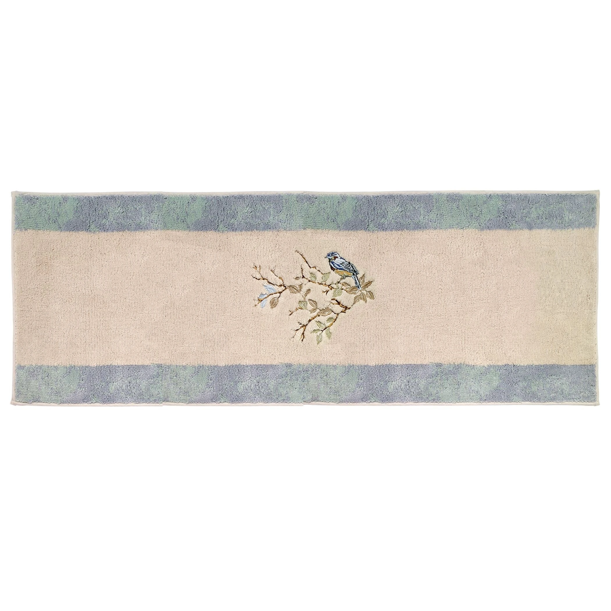 The Avanti Love Nest Rug is tufted in 100% cotton with an off-center embroidered bird sitting on a branch. The ivory ground rug is bordered top and bottom with a coordinating blue border. This oversized rug is skid resistant and machine washable.