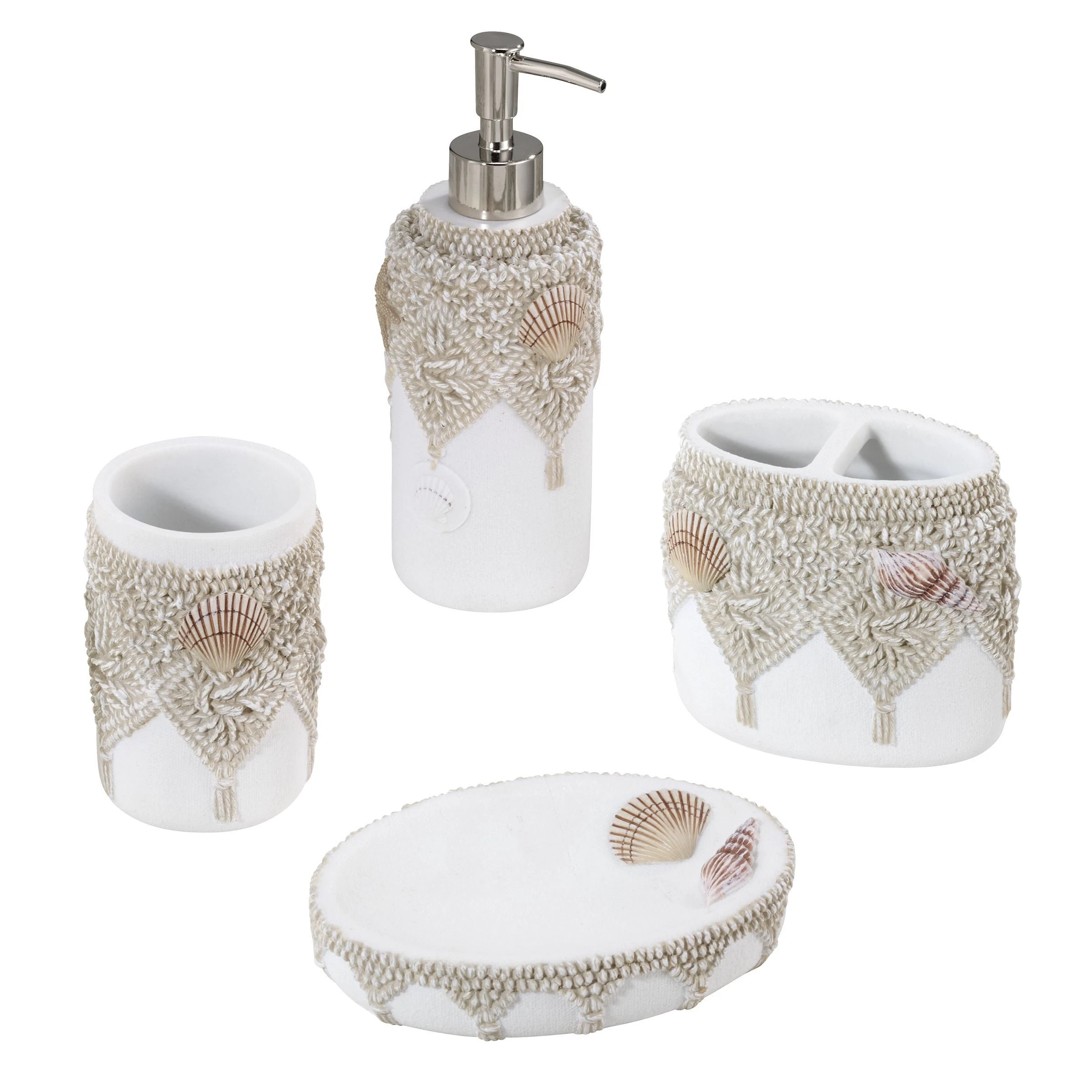 The Avanti Macrame Shells 4 Pc. Bath Accessory Set is decorated with life-like faux macrame details with tassels, shells and other sea creatures. Made of durable, hand-painted resin, textured, off-white background. Set includes one each of tumbler, toothbrush holder, soap dish and lotion dispenser.
