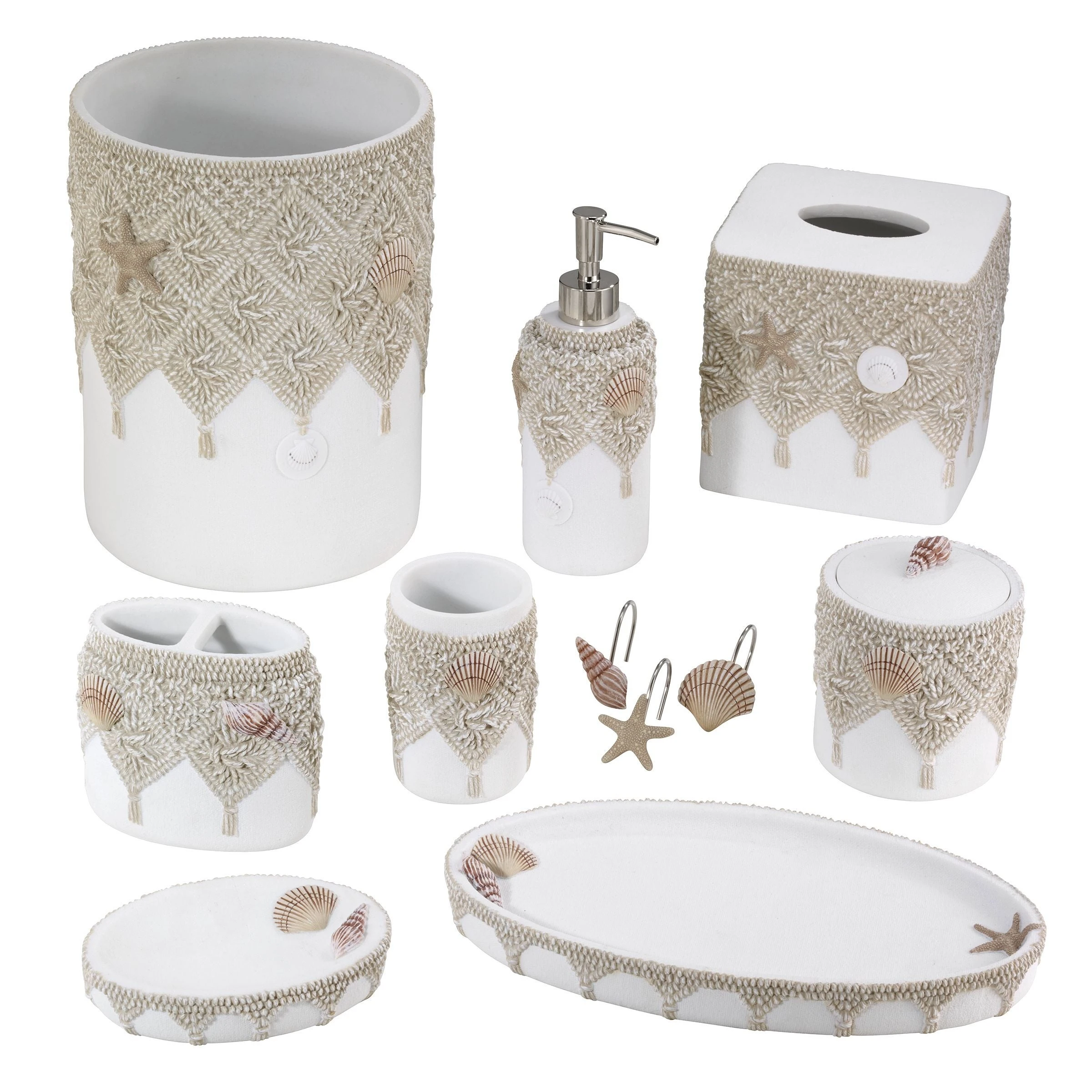 The Avanti Macrame Shells Round Wastebasket is decorated with life-like linen-colored faux macrame detail with tassels, starfish and shells on the top half. The bottom is a textured off-white ground. Made of durable, hand-painted resin, wipe clean.