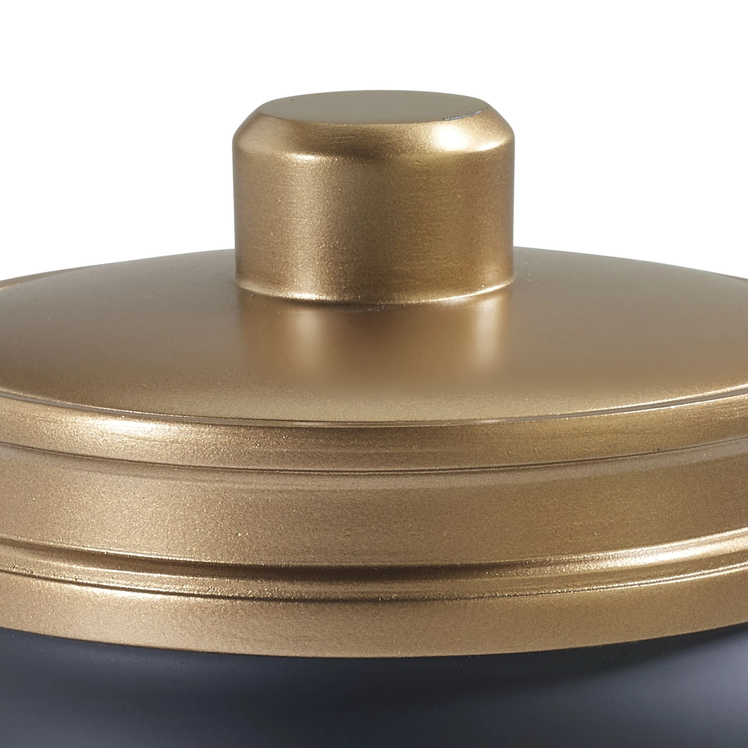 The Avanti Memphis Covered Jar delivers a smooth matte black finish with beveled industrial accents in vintage gold metallic. Crafted in durable resin for long life. Full coordinating bath accessory collection is available. Imported.