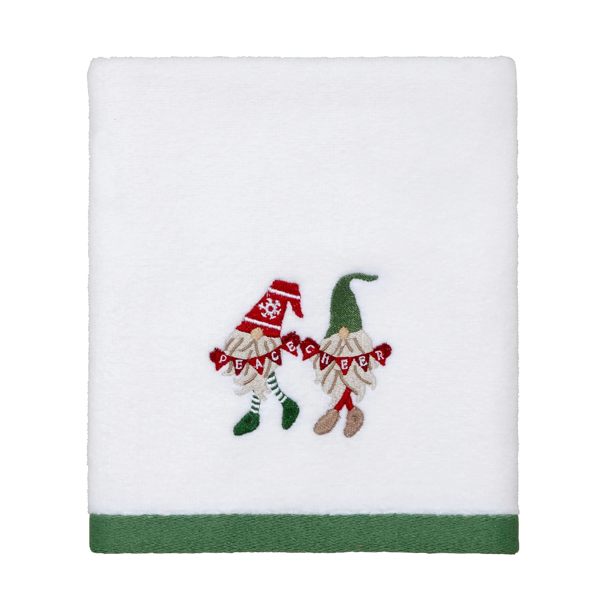 The Avanti Merry Gnome Decorative Hand Towel features two embroidered festive gnomes dressed in holiday hats, pants and shoes holding banners that say “Peace” and “Cheer”. The 100% cotton velour white towel is finished with a woven green polyester border. 16″ x 28″, machine washable.