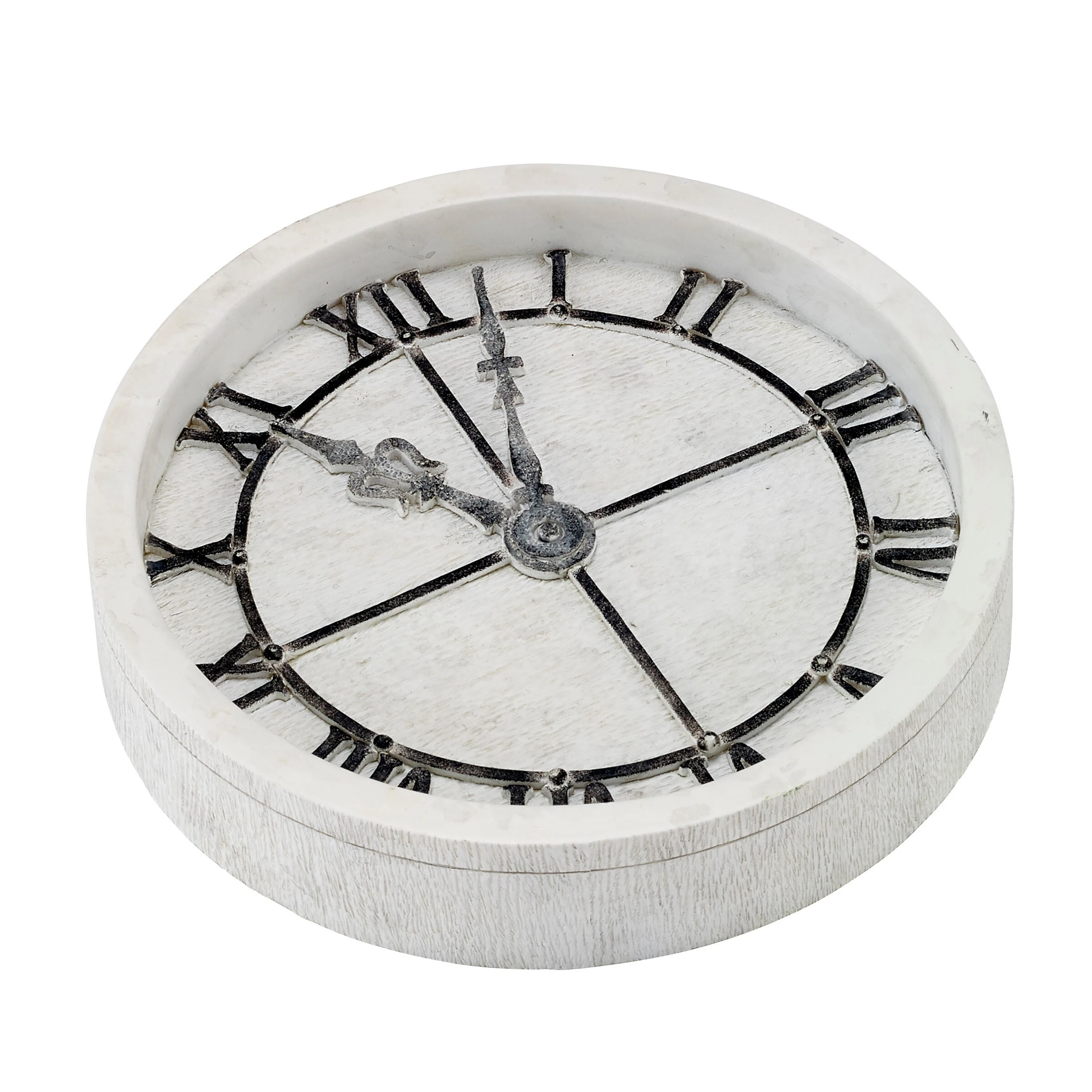 The Avanti Modern Farmhouse Soap Dish depicts a classic clock with roman numerals with a woodgrain base. Crafted in great detail in hand-painted resin, imported.