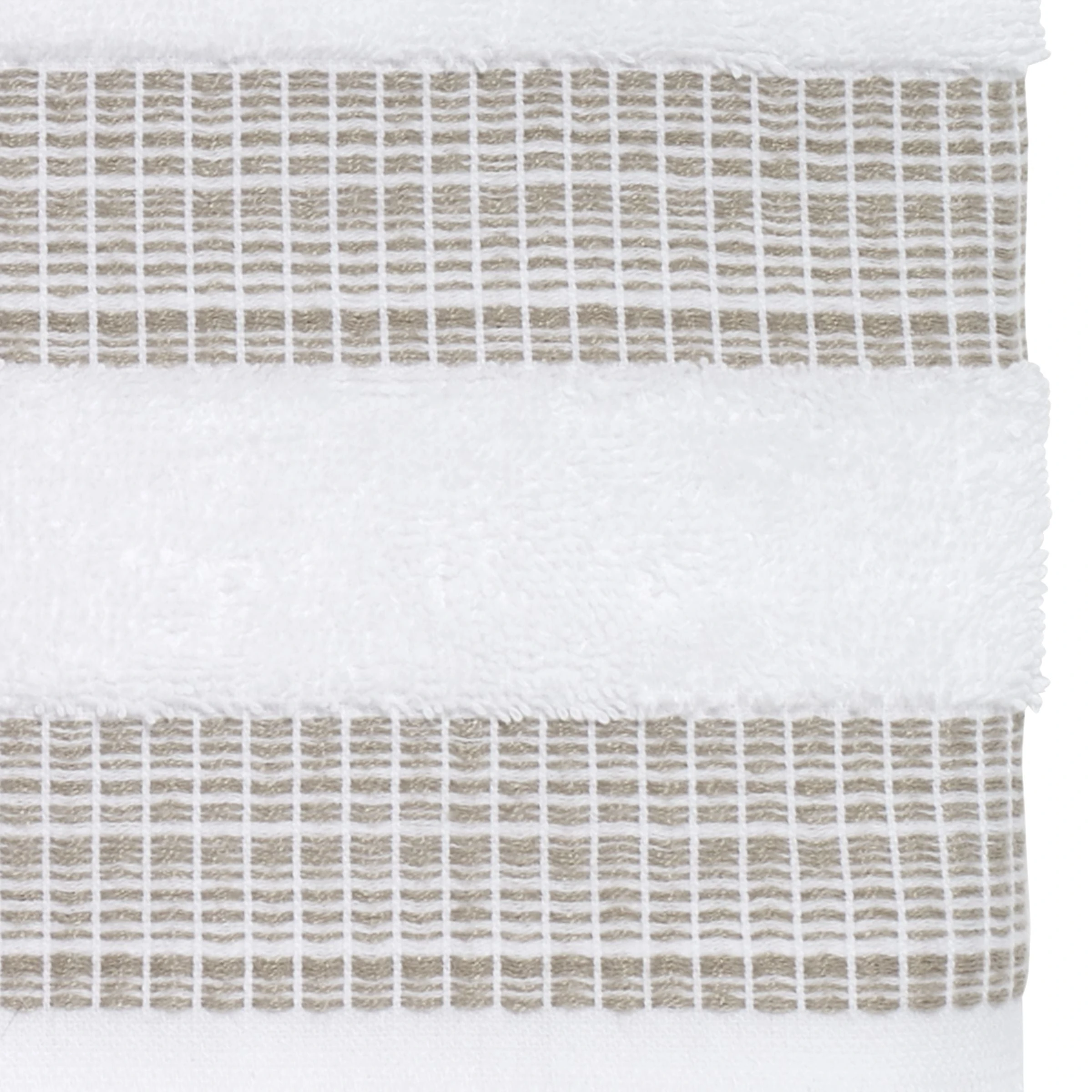The Avanti Oasis Linen Bath Towel features 2 sections on the white ground with ย ย linen light-to-dark space-dyed yarns. 27 x 54 in. terry towel is finished with a 1.8 in. fringe. Made of ย 100% ringspun cotton for soft feel, superior absorbency. Imported. ย ย ย ย