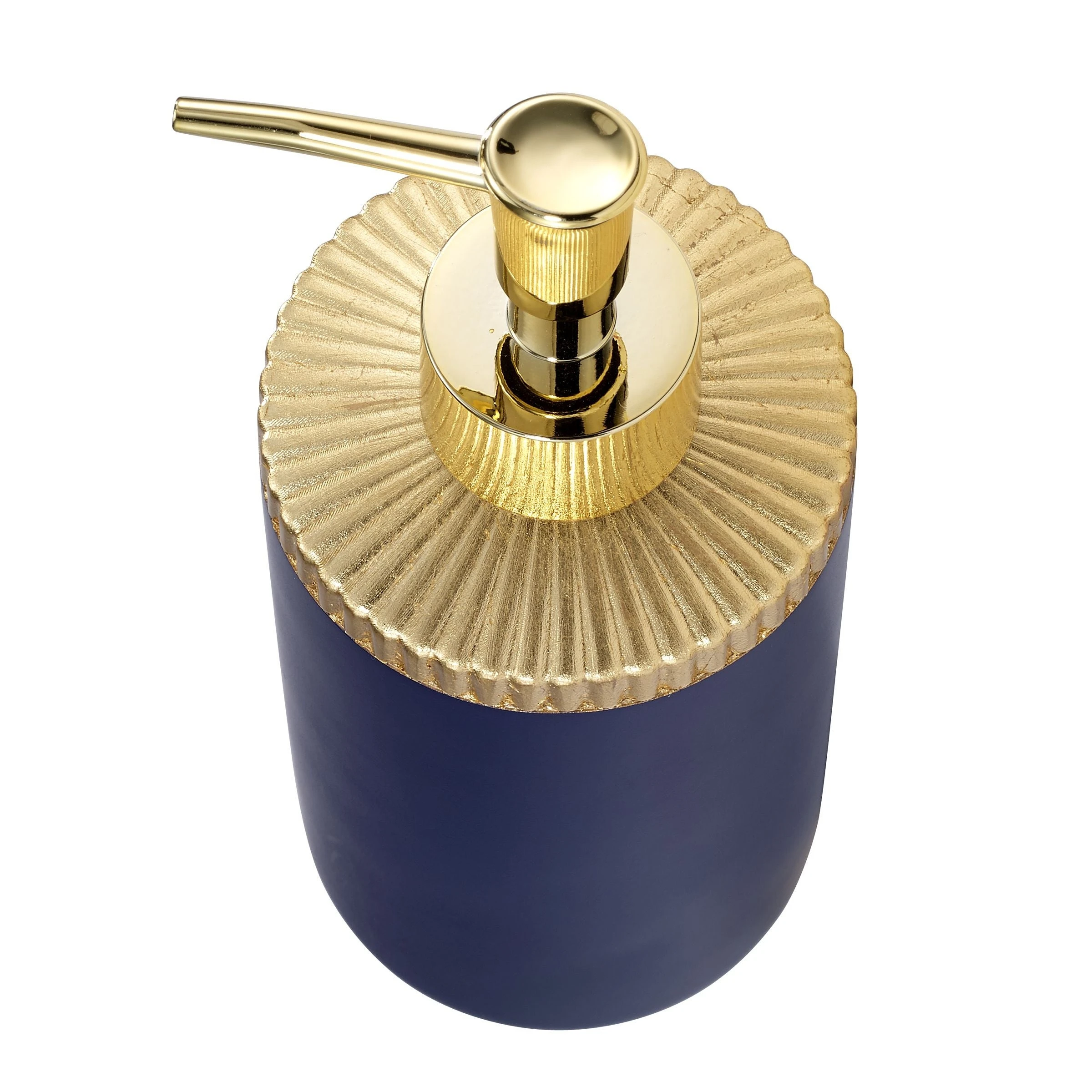 The Avanti Riviera Lotion/ Soap/ Sanitizer dispenser is a stunning combination of a smooth navy body with a ribbed gold foil top and coordinating gold bottom. Use in the bathroom, kitchen, office or anywhere in your house.. Made of durable resin for long-lasting use.