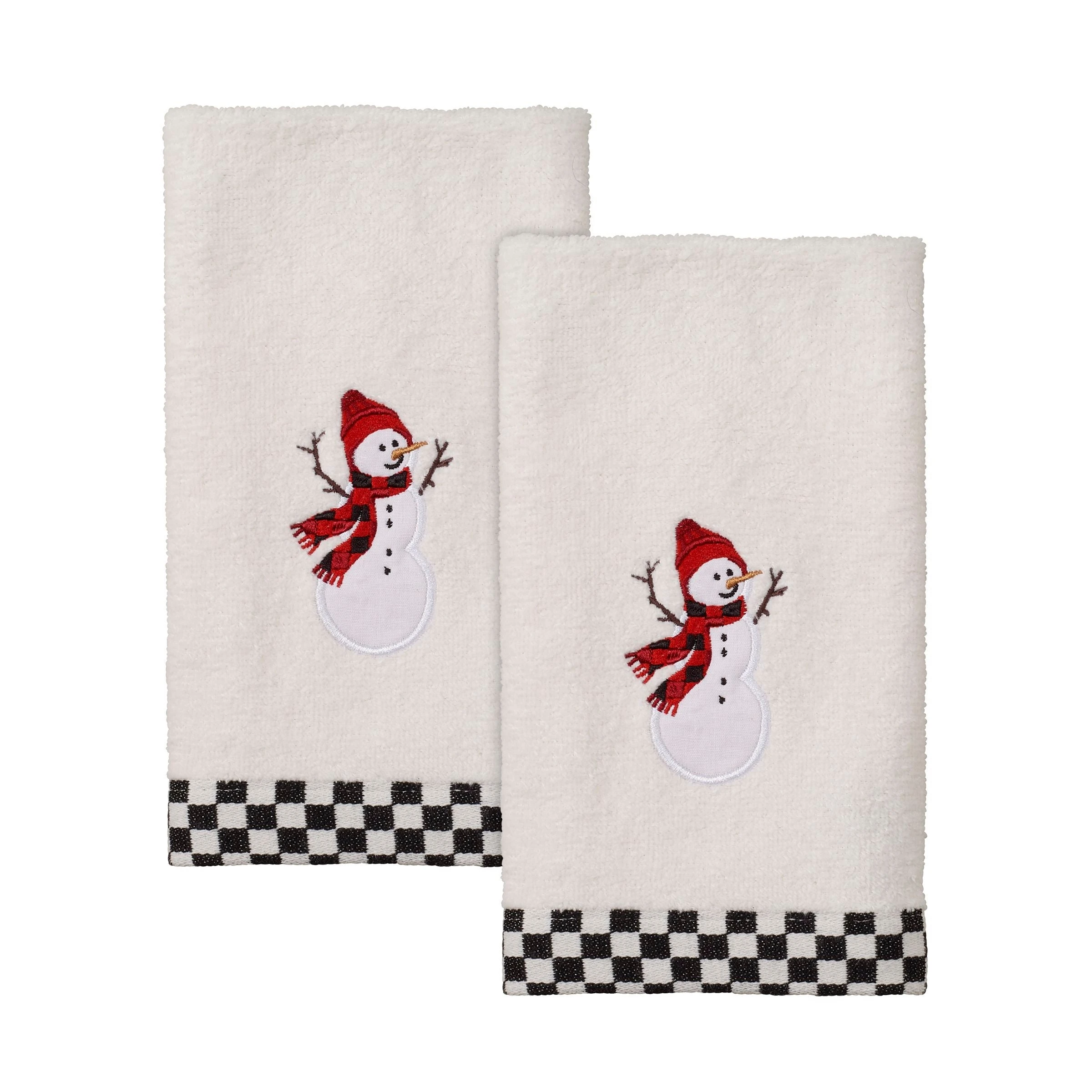 The Avanti Rustic Pals Embellished 2-Pack of Fingertip Towels is decorated with an embroidered snowman with a black and red scarf and red ski hat with pom-pom. The 100% cotton linen velour towels are finished with a black and white check polyester border. 11″ x 18″, machine washable.