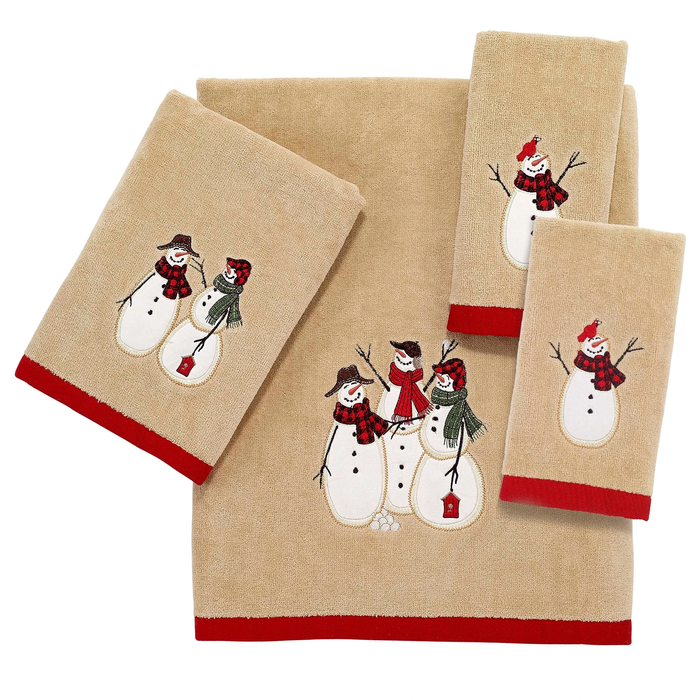 The Avanti Snowmen Gathering Fingertip Towel 2 Pack features a happy embroidered snowmen on a 100% cotton tan towel. The towel is finished with a coordinating red woven border. Imported.