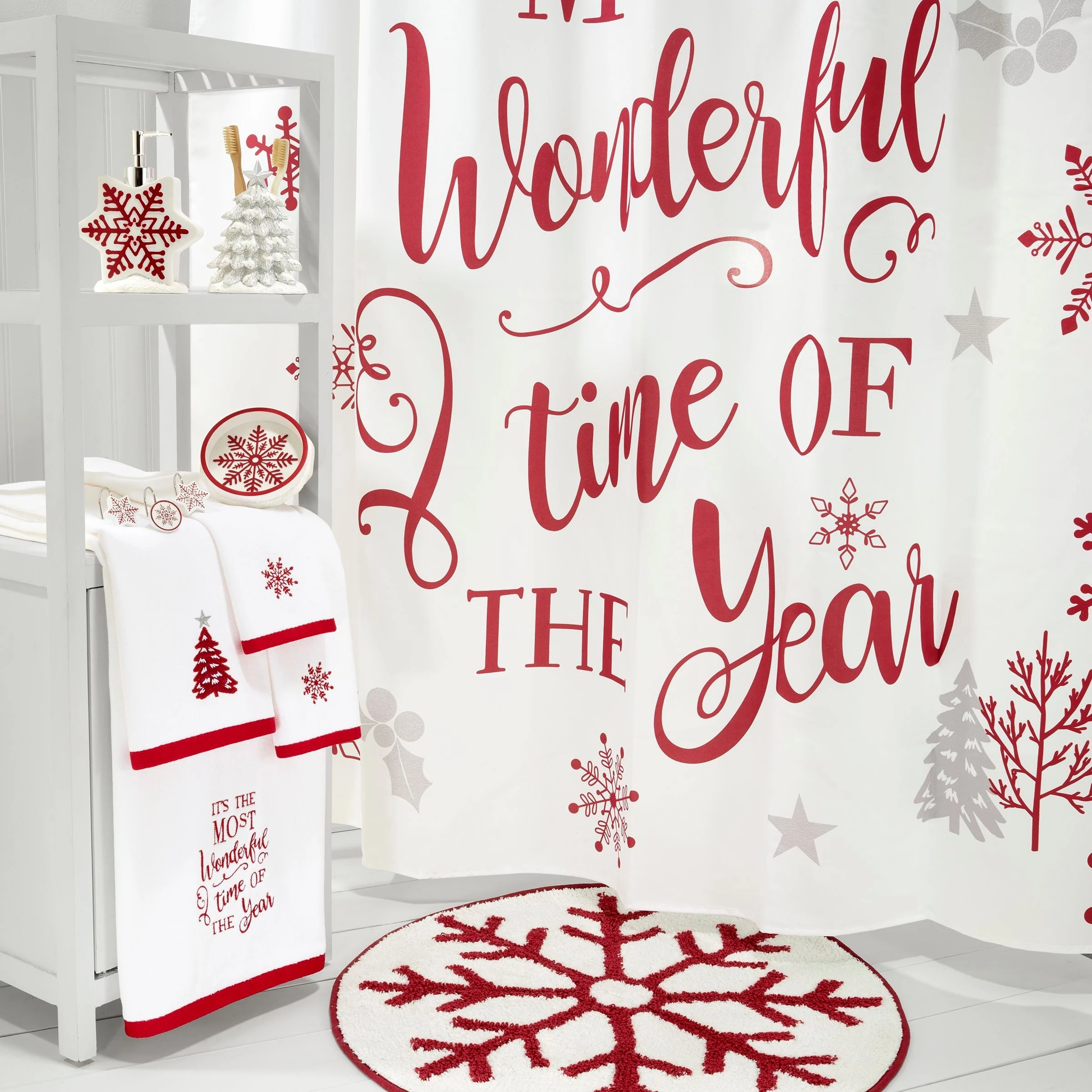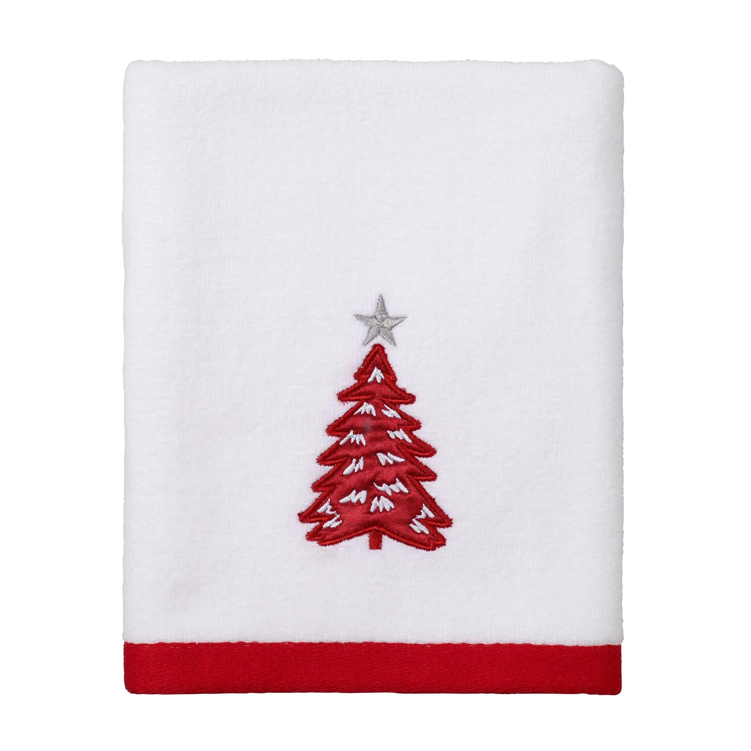 The Avanti Sparkle Decorative Hand Towel features an embroidered red Christmas tree with silver accents, white snow and a silver star on top. The 100% cotton white velour towel is finished with a coordinating red woven polyester border. 16″ x 28″, machine washable.