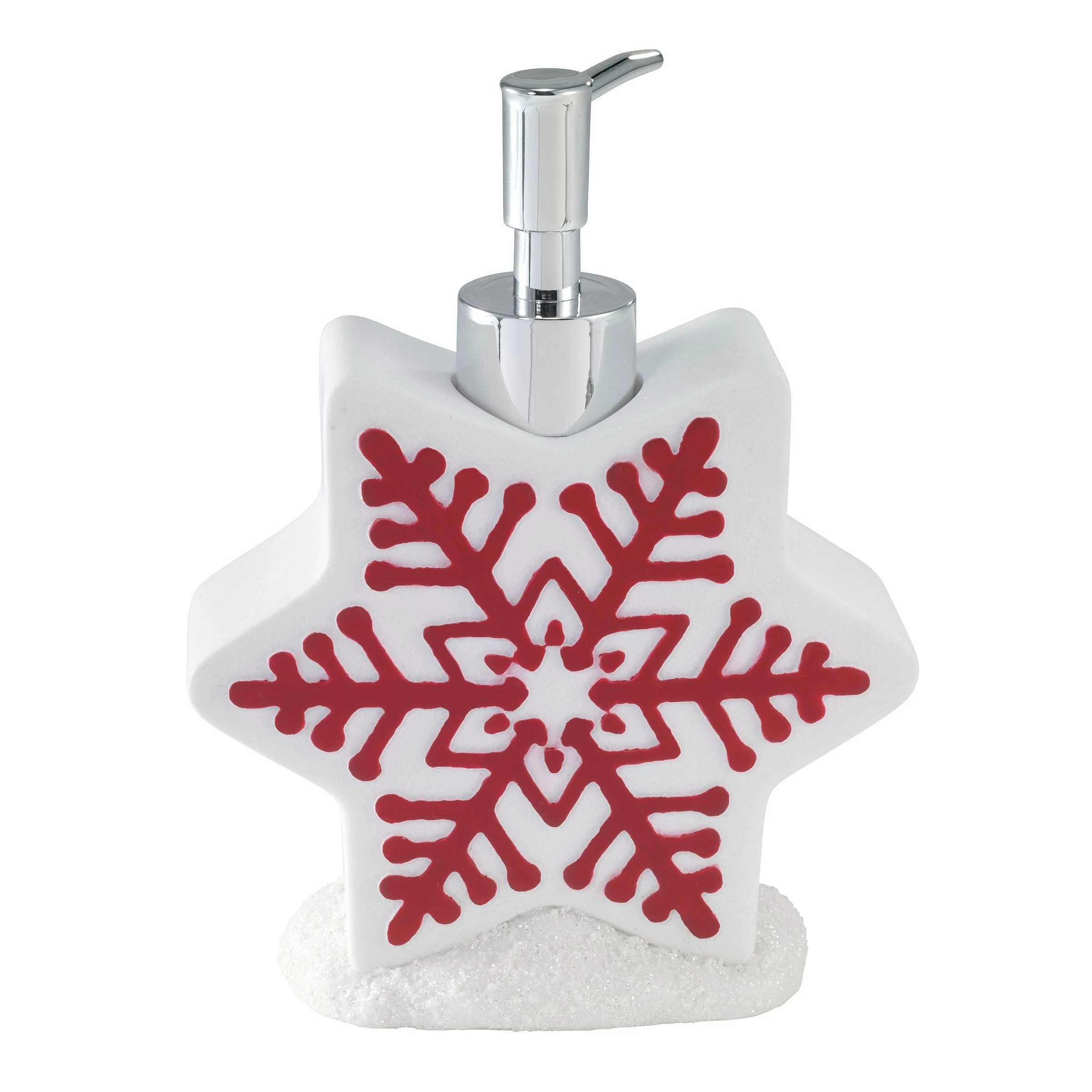 The Avanti Sparkle Lotion/ Soap/ Sanitizer Dispenser features a brick red snowflake on a white ground on a star-shaped body sitting on a base of snow. It’s a perfect way to add a touch of the holidays to any bathroom, kitchen or office. Made of durable, hand-painted resin.