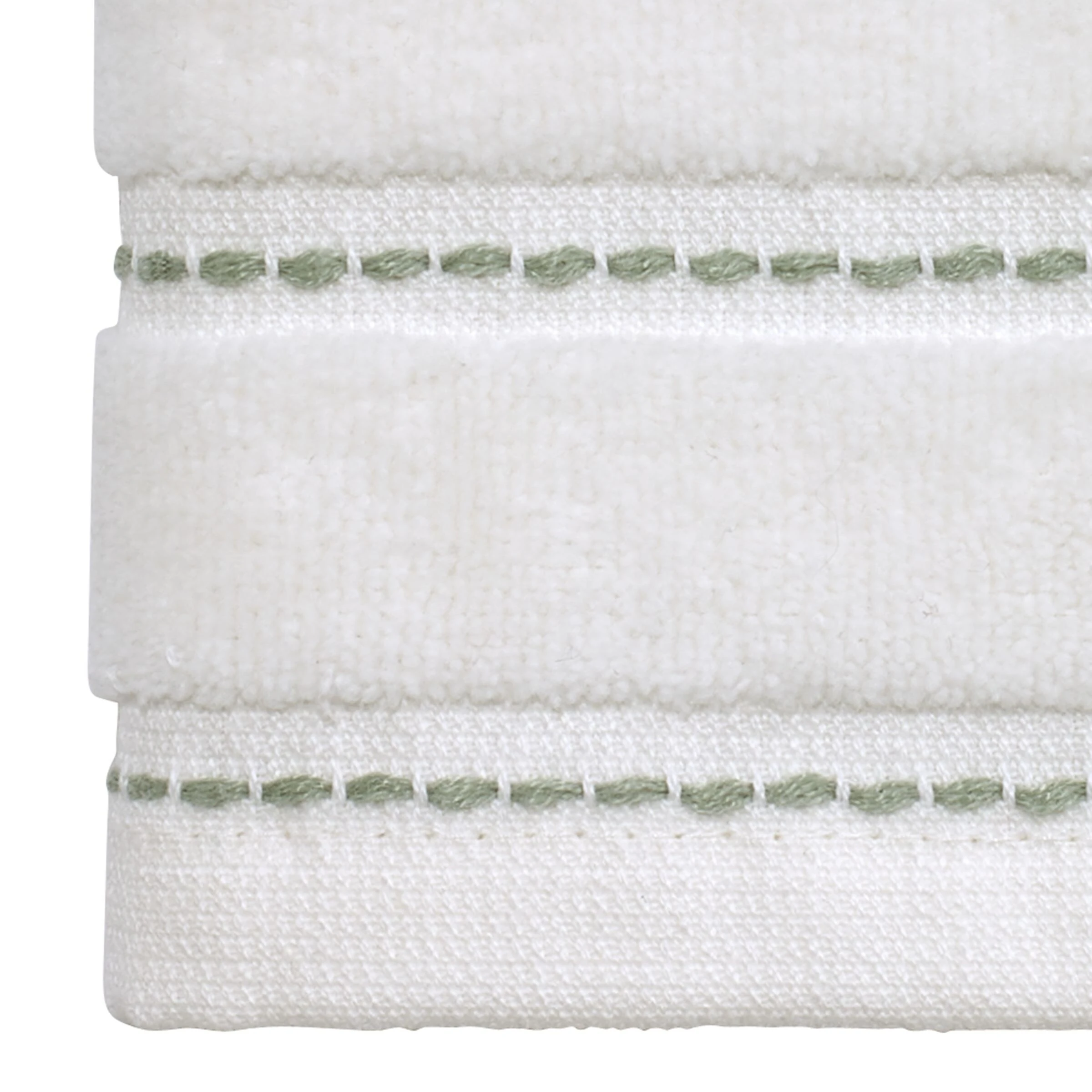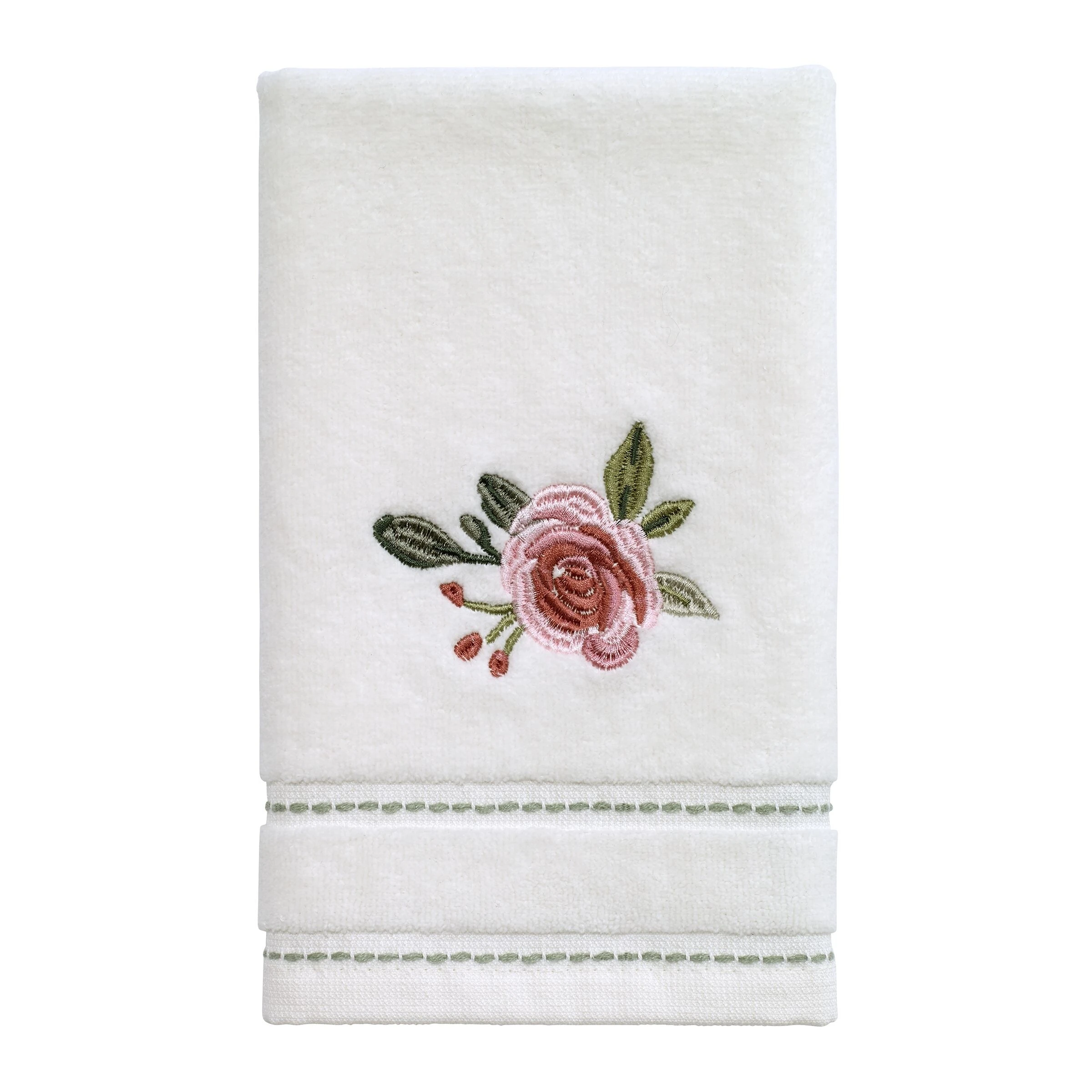 The Avanti Spring Garden Fingertip Towel is decorated with an embroidered peony in shades of pink with green leaves and woven, yarn-dyed green border stripes on an ivory ground. Made of soft and absorbent 100% ring spun cotton, 11 x 18 inches. Coordinates pieces also available. Imported.