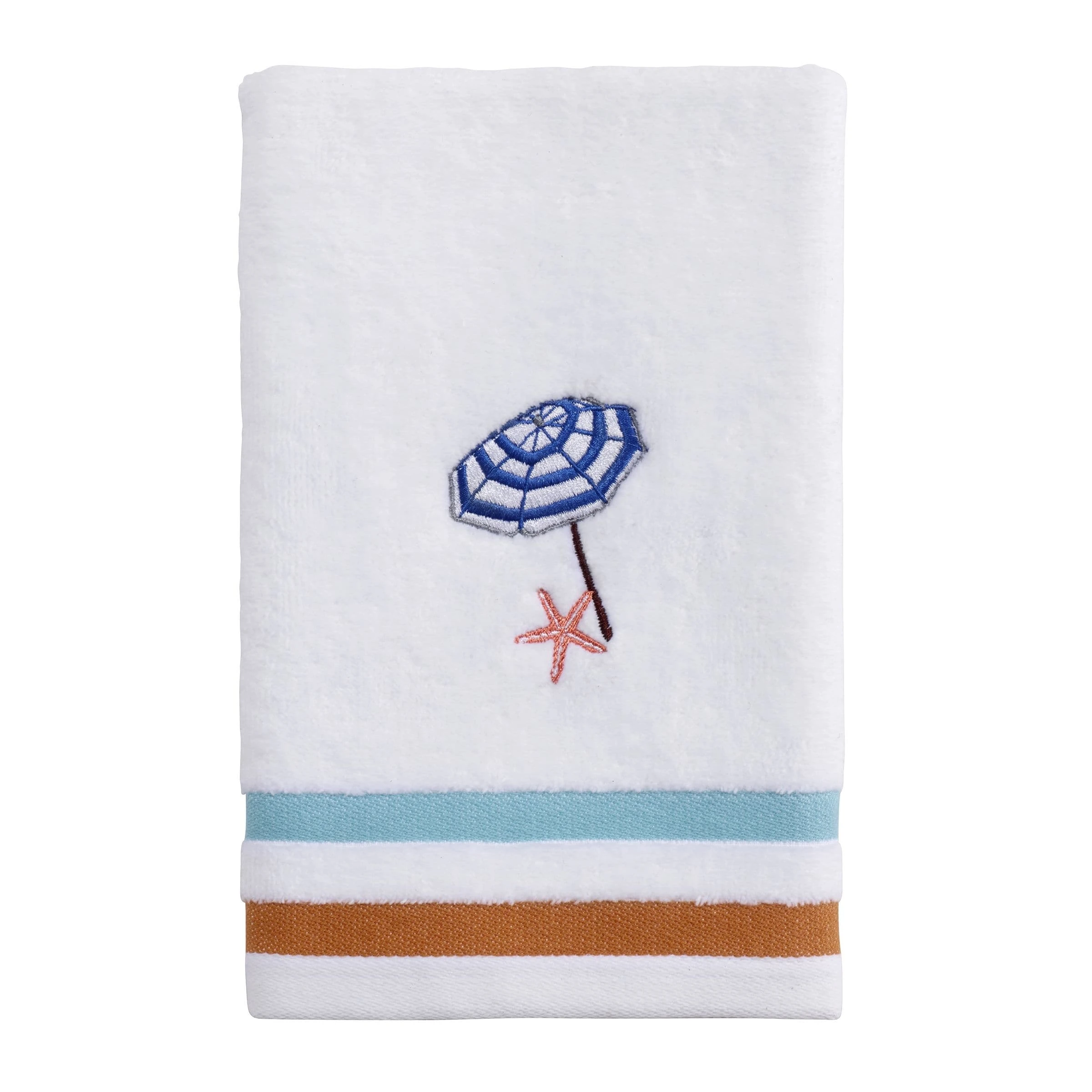The Avanti Surf Time Decorative Fingertip Towel features a blue and white embroidered beach umbrella with a yellow starfish. The 11″ x 18″ white terry towel is made of 100% cotton (excl. of embellishment). The sky blue and coral borders add the perfect finish to the towel.