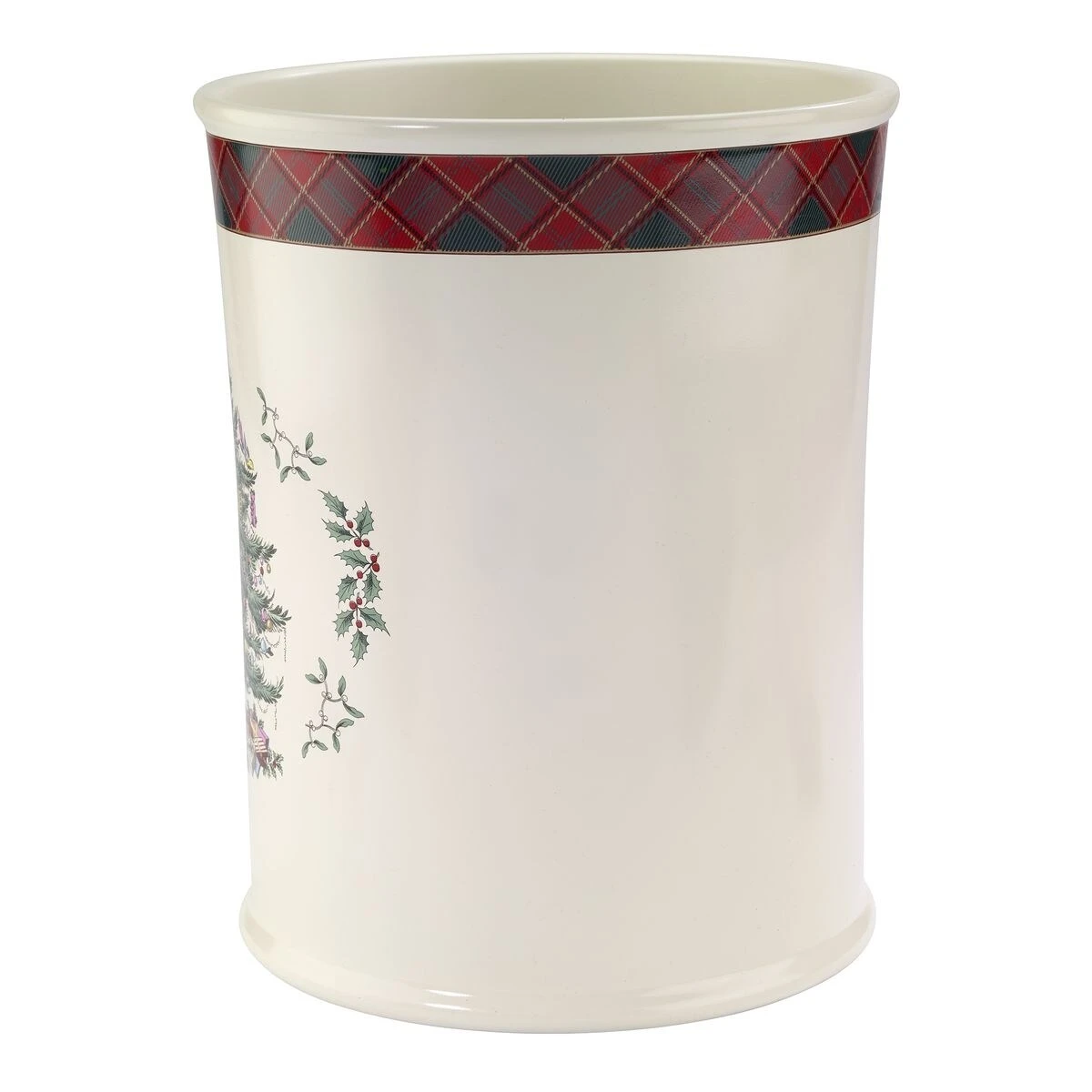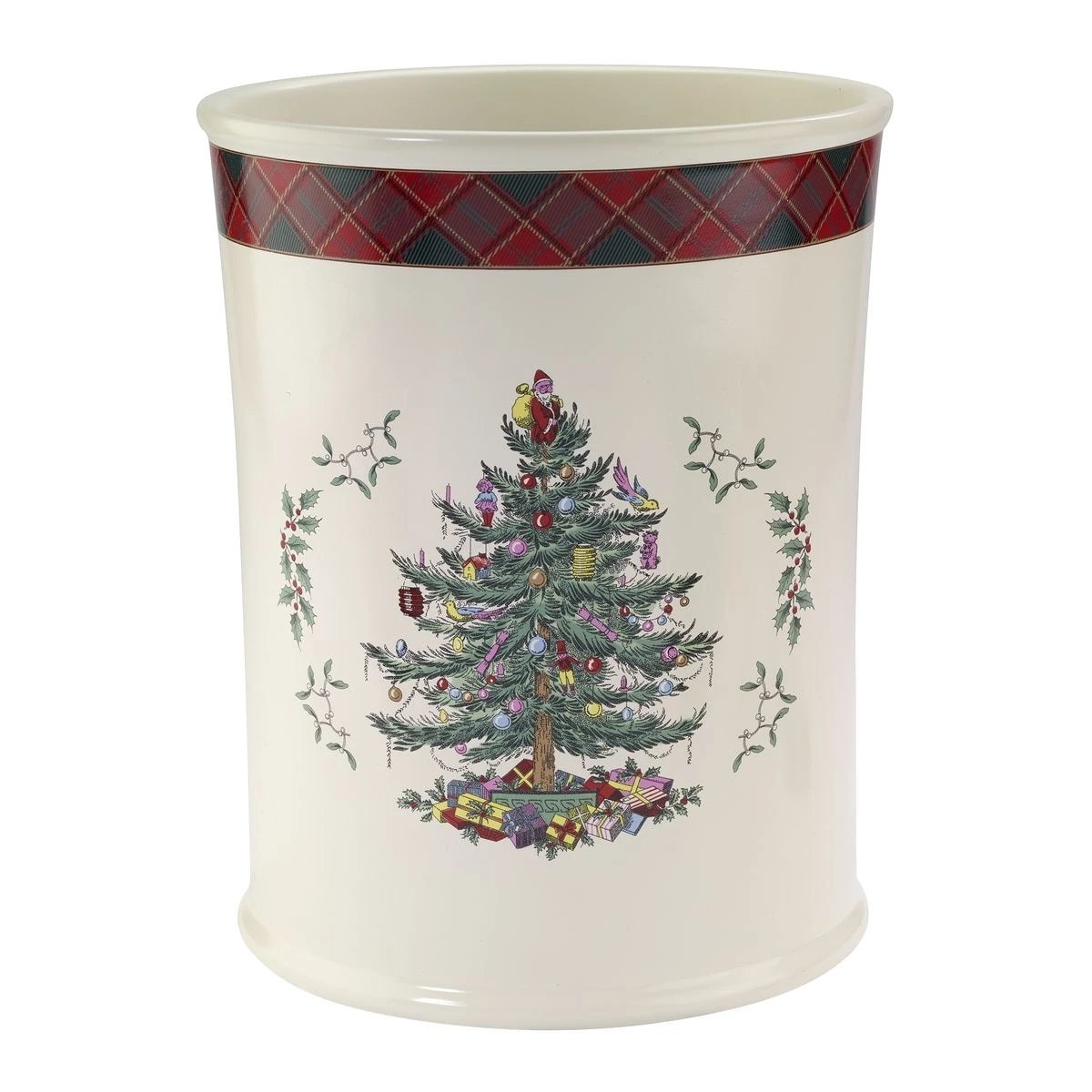 The Spode Christmas Treeยฎ Tartan Wastebasket by Avanti brings a new twist to an old classic. The iconic Spode Christmas Tree, since 1938, it is now paired with a green and red tartan plaid border on an ivory body for a fresh look. Made of durable resin, measures 7.88″L x 7.88″W x 10″H. Imported.
