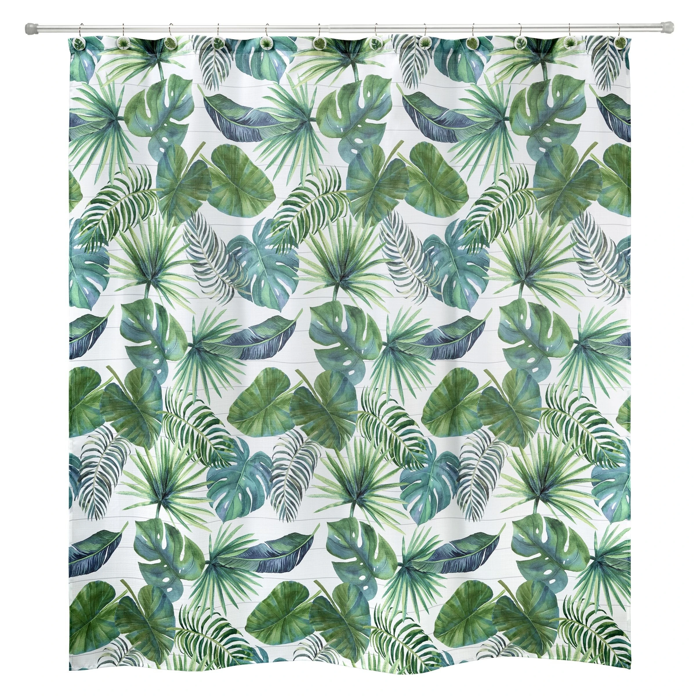 The Avanti Viva Palm Shower Curtain features a beautifully printed collage of tropical leaves in a wide range of greens on a shiplap background. This bold pattern is printed on a white textured 100% polyester cloth for easy care. 72″ x 72″.