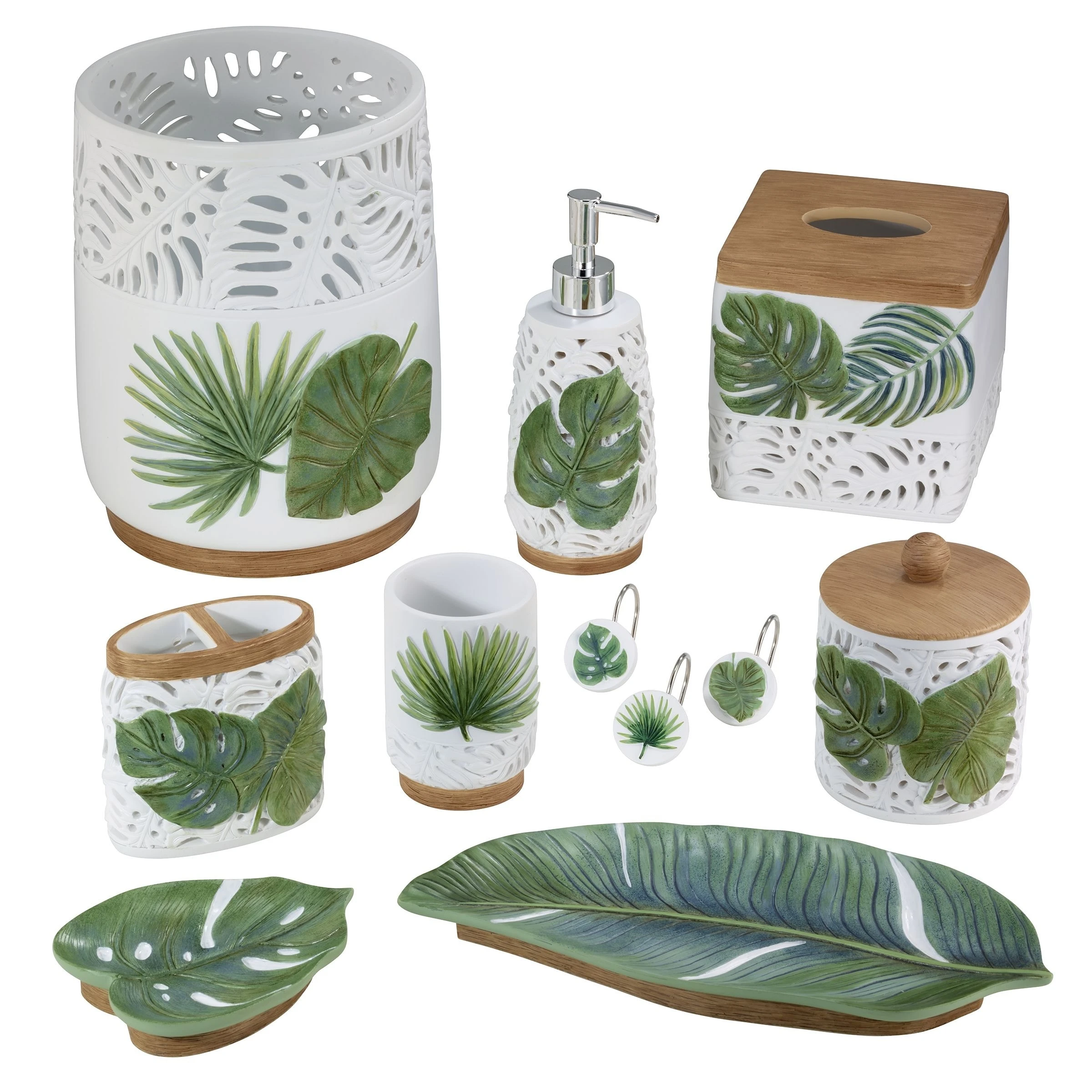 The Avanti Viva Palm Tray features a figural banana leaf as the base of the piece in multiple shades of green with white highlights. The base is decorated with a faux-wood finish. Made of durable, hand-painted resin for long-lasting use 10.5″ W x 4.5″ D x 1.2″ H.