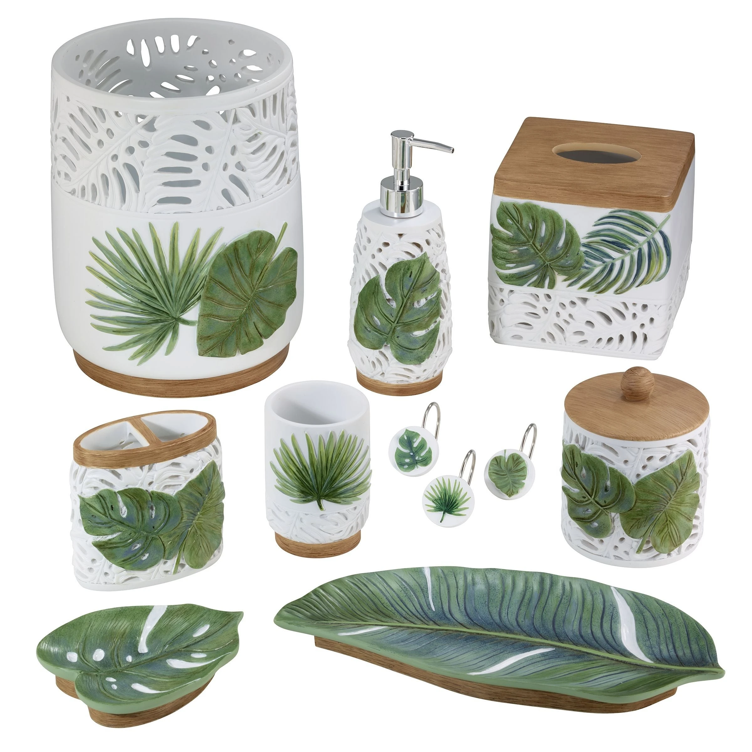 The Avanti Viva Palm Tumbler features a textural white leaf cut-out background with a large three-dimensional petticoat palm leaf in multiple shades of green. The base is decorated with a faux-wood finish. Made of durable, hand-painted resin for long-lasting use.