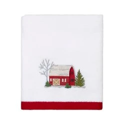 The Avanti Warm Welcome Decorative Hand Towel features an embroidered winter scene with a classic red barn with snow-covered roof and surrounded by trees. The 100% cotton white velour towel is finished with a woven red polyester border. 16″ x 28″, machine washable.
