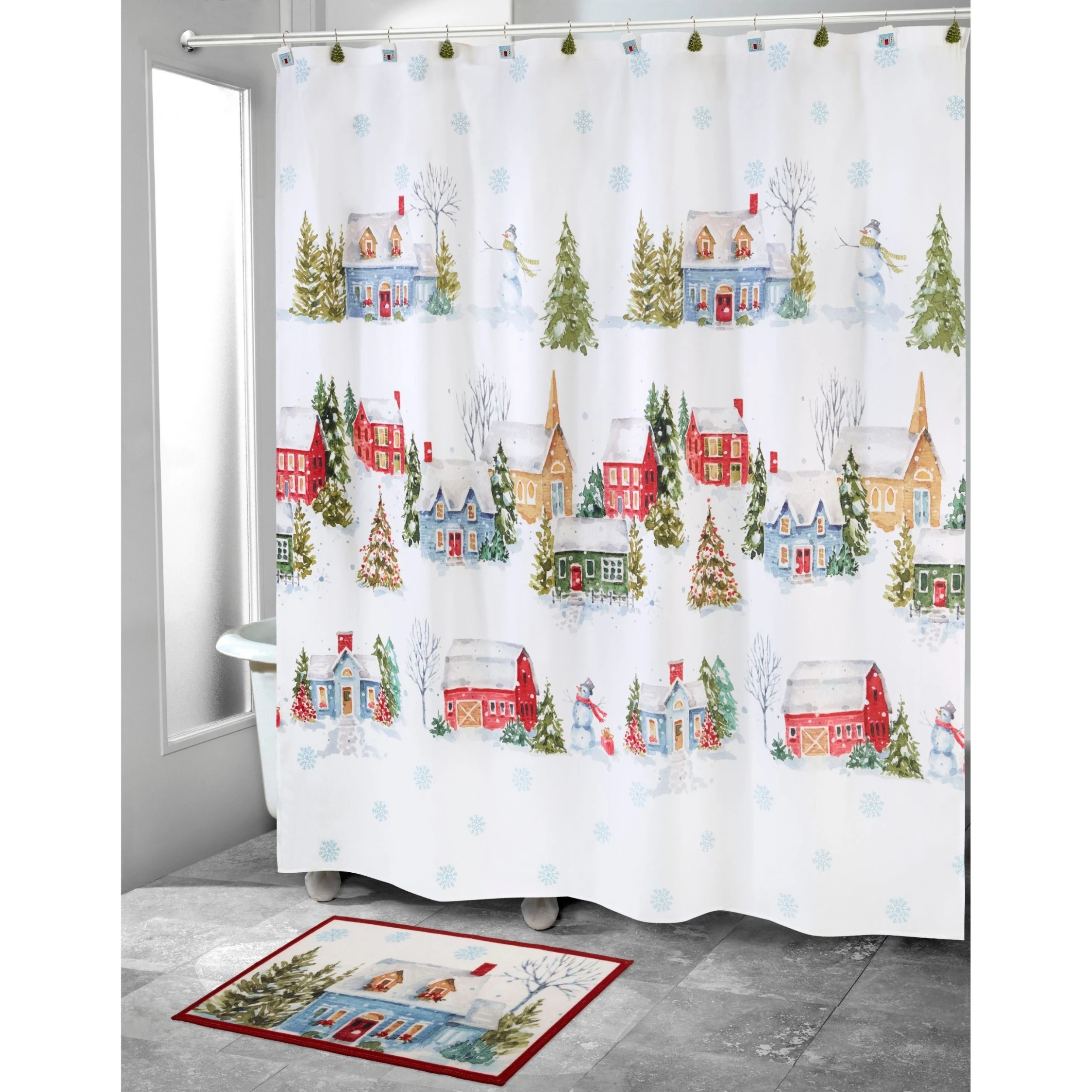 The Avanti Warm Welcome Decorative Bath Rug features a light blue house decorated for the holidays in a winter scene with pine trees and snowflakes on a white ground. A coordinating red border frames the rug. Printed on 100% polyester, 20″ x 30″.