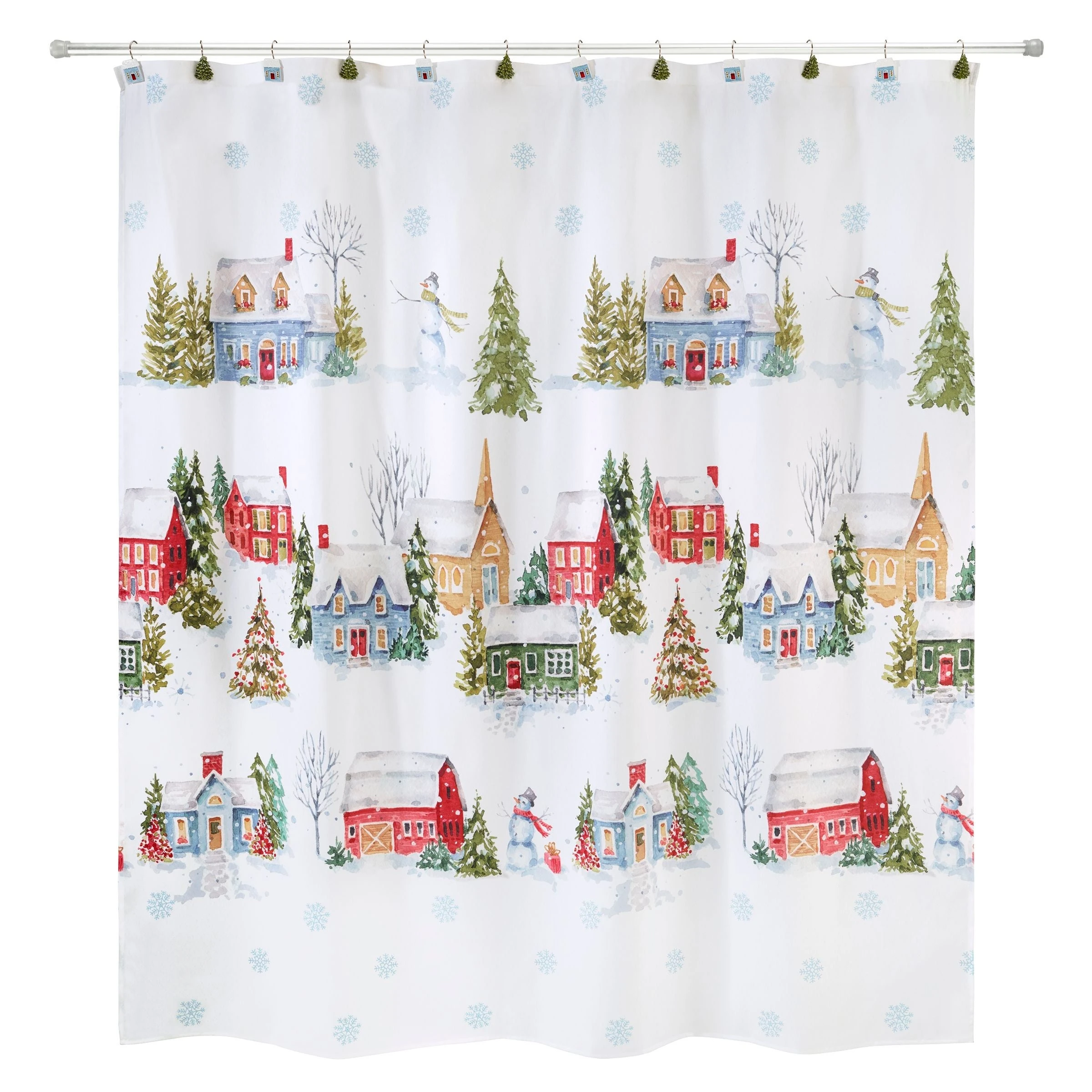 The Avanti Warm Warm Welcome Shower Curtain features a delightful winter village scene of colorful houses and barns, mixed with snowmen, trees and snowflakes on a white ground. Printed on 100% polyester for easy care, 72″ x 72″. Available in matching shower curtain hooks, lotion dispenser, rug and towels.