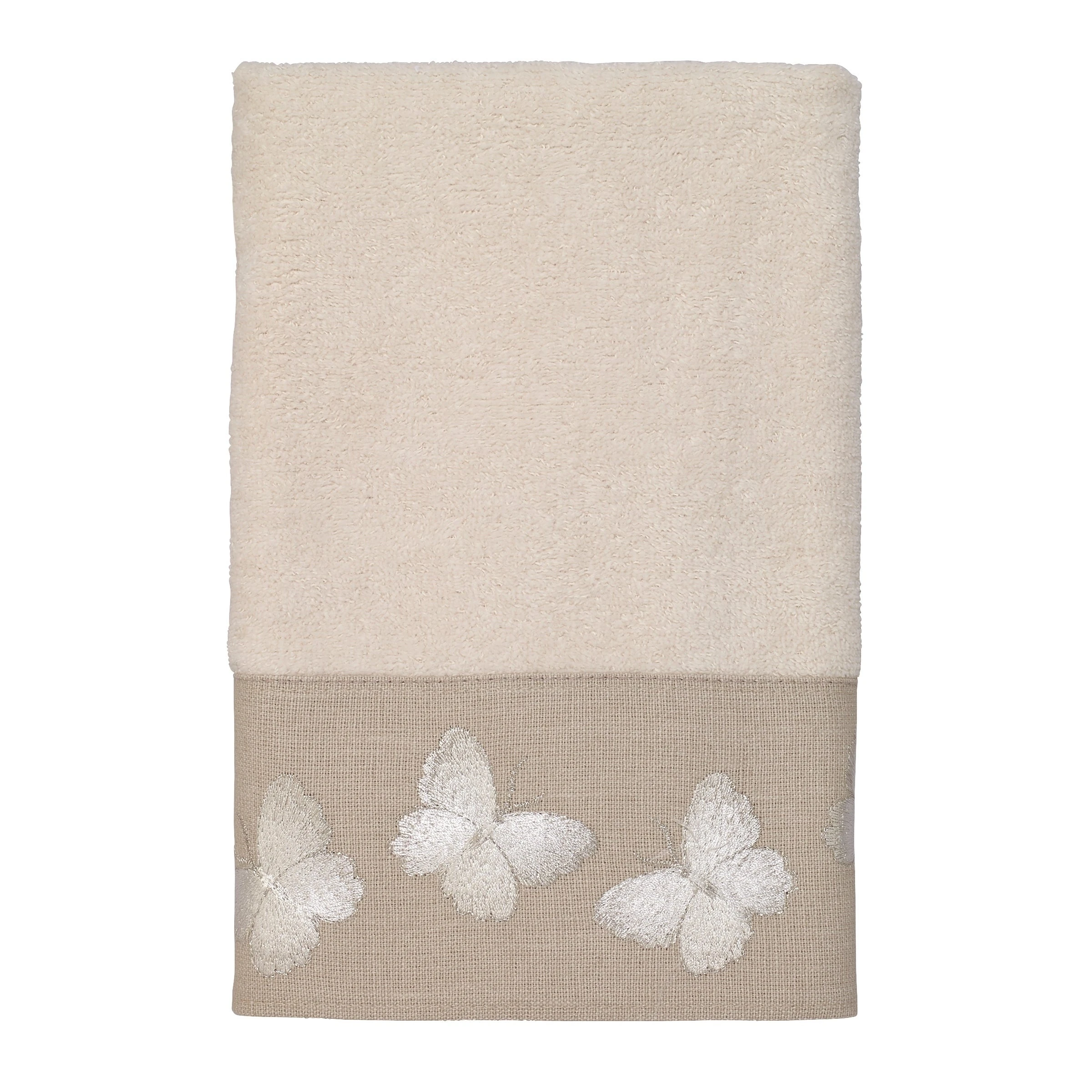 The Avanti Yara Hand Towel features a series of delicately embroidered white butterflies on a beige border attached to a 100% cotton ivory velour towel. Imported.
